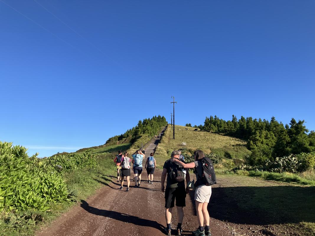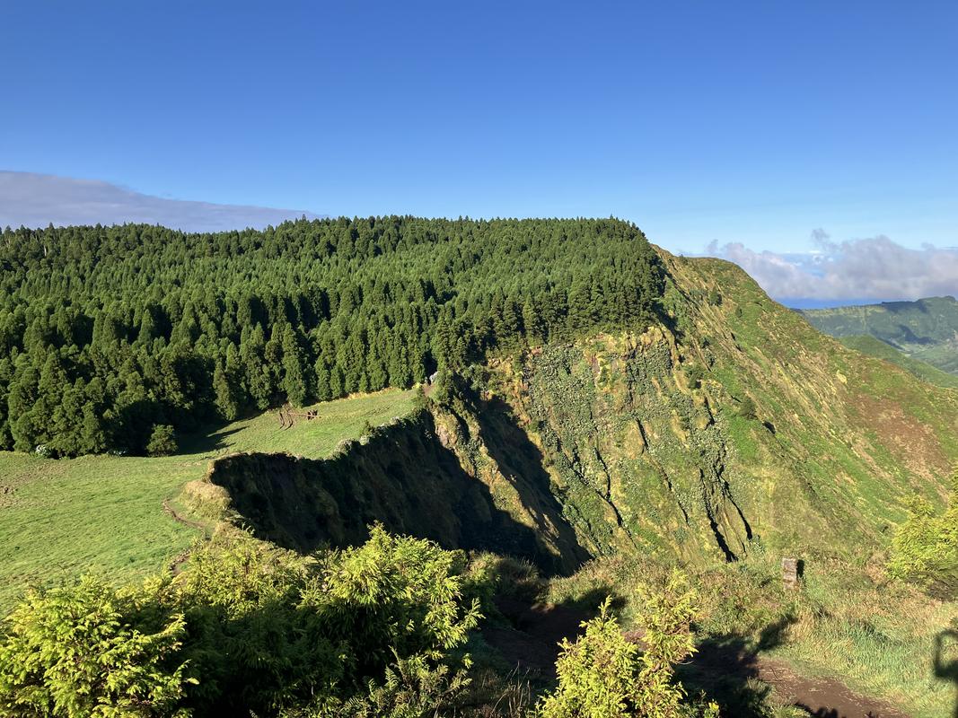 Pokračovali jsme dál po široké silničce směrem na Pico da Cruz (845 m), v obou směrech po ní jezdilo docela dost aut a také čtyřkolek. Po krátké zastávce na vrcholu jsme nepokračovali dál po značce, která obkličuje kalderu sopky Sete Cidades (Sedmiměstí) z východu a severu, nýbrž jsme se vrátili asi 700 m zpět po silnici. Když jsme z ní konečně odbočili na pěšinu k ikonické vyhlídce Boca do Inferno (Pekelná díra), těšil jsem se, že konečně bude klid. Omyl, vyhlídku mezitím obsadily davy lidí, které sem došly z nedalekého parkoviště.