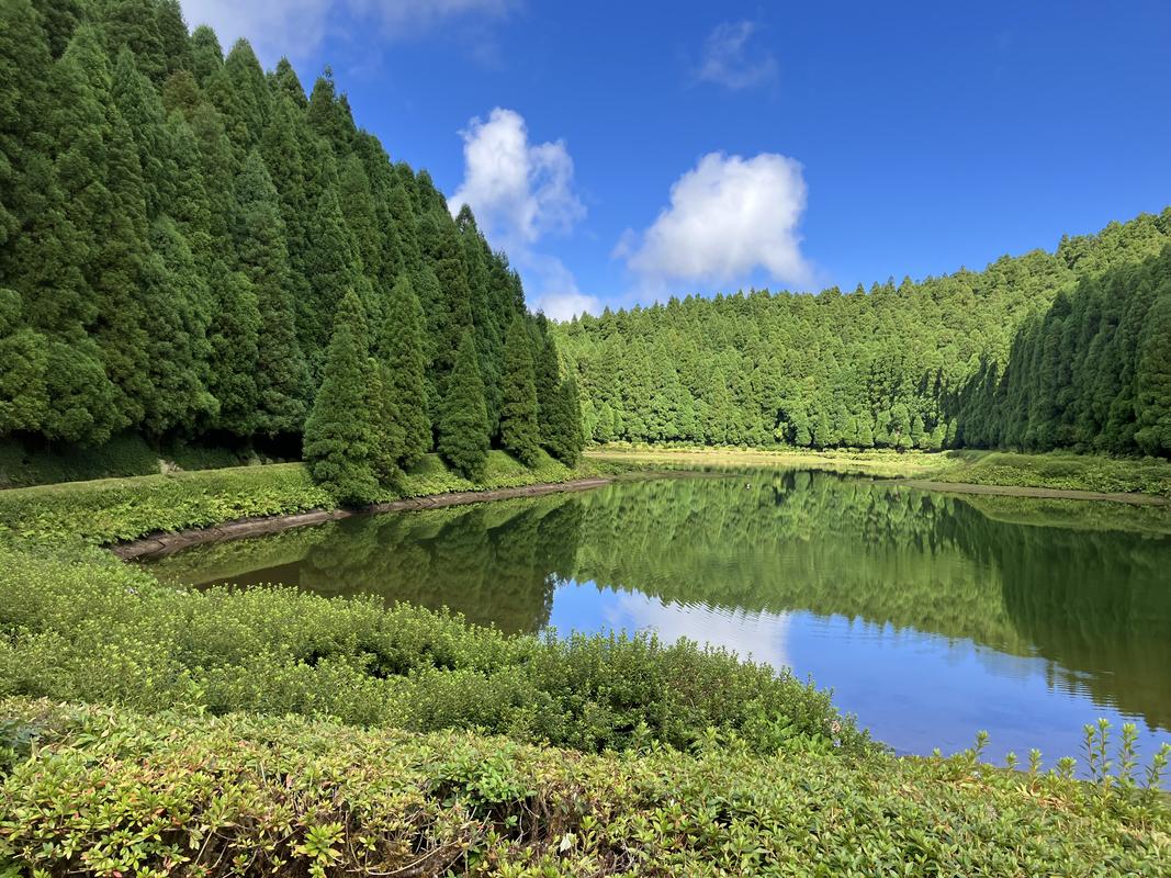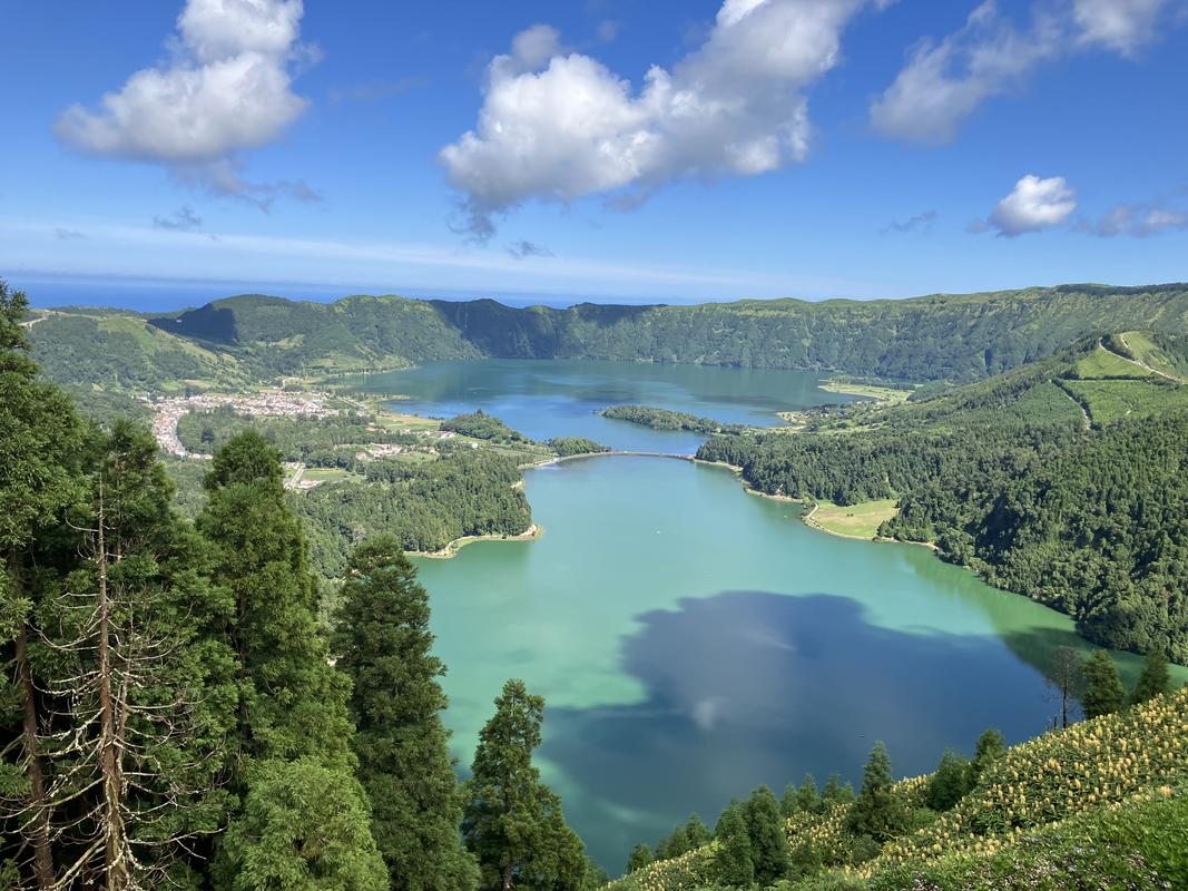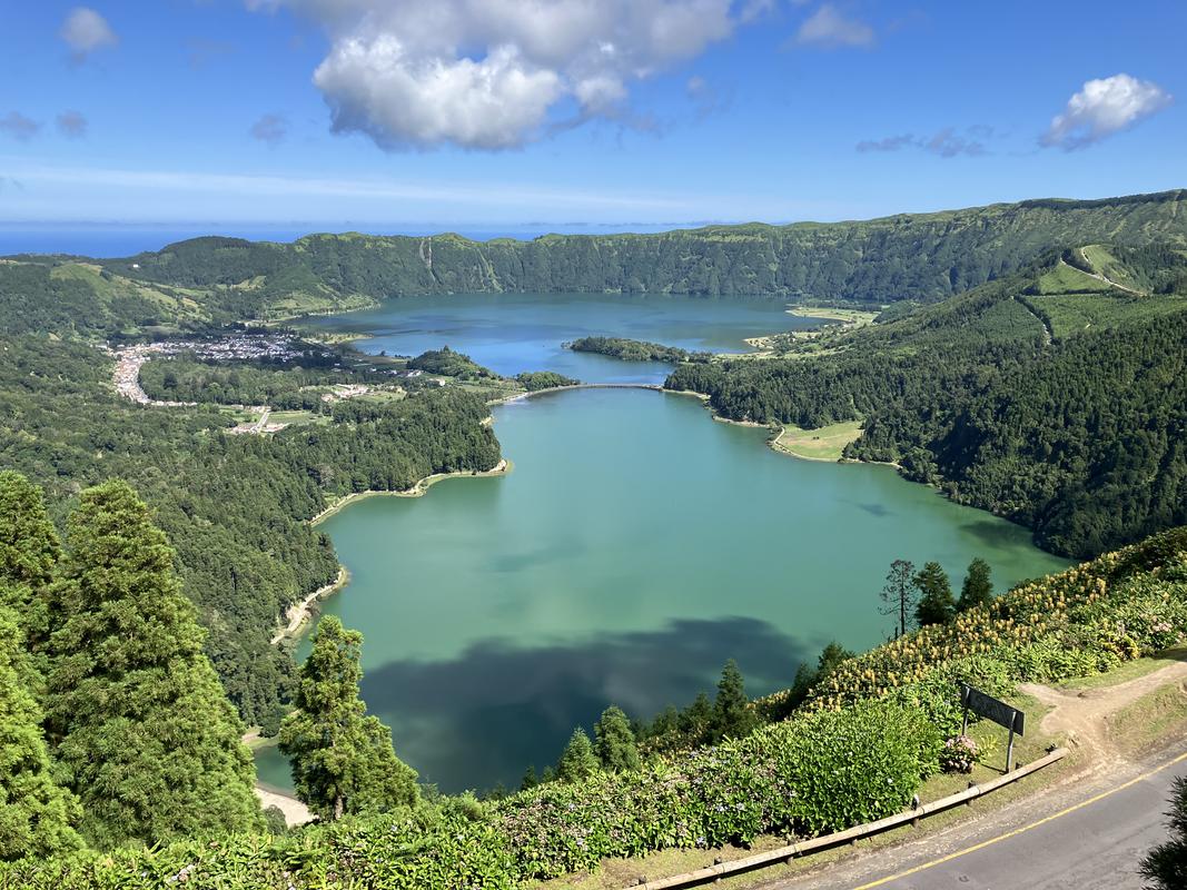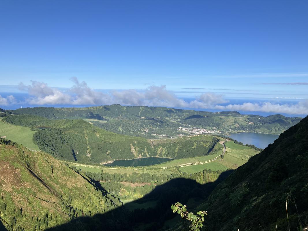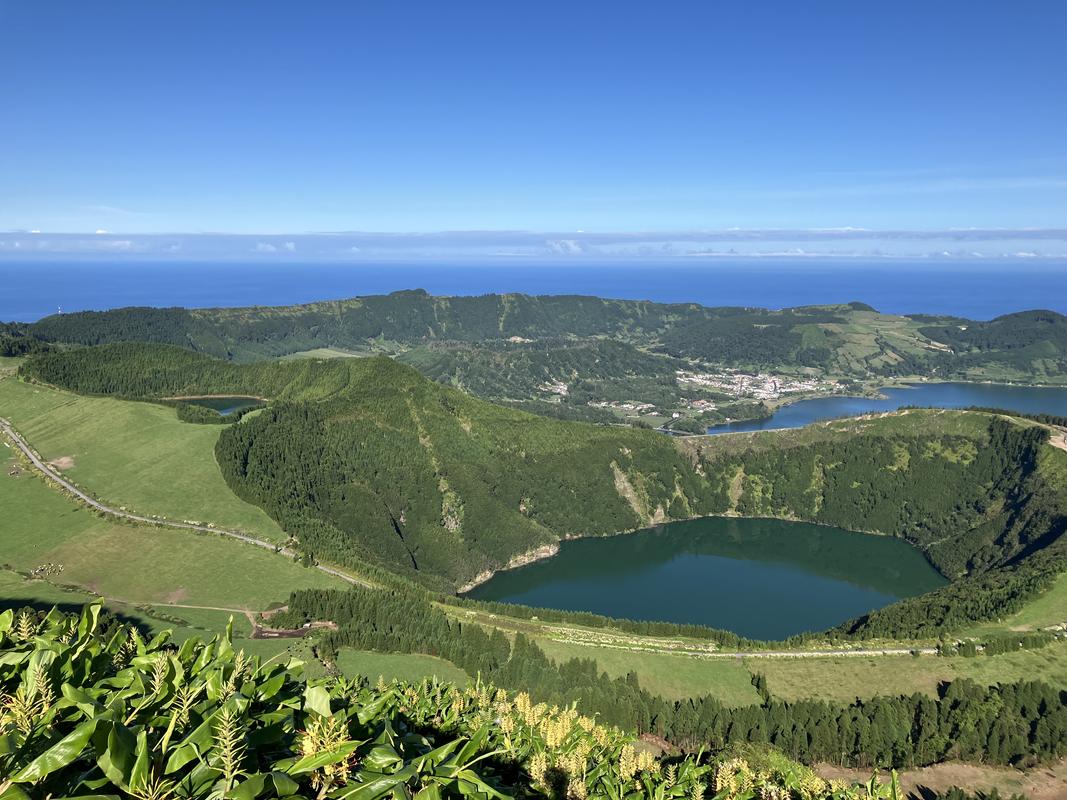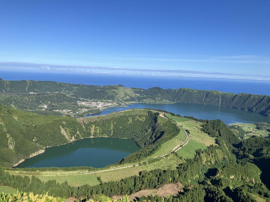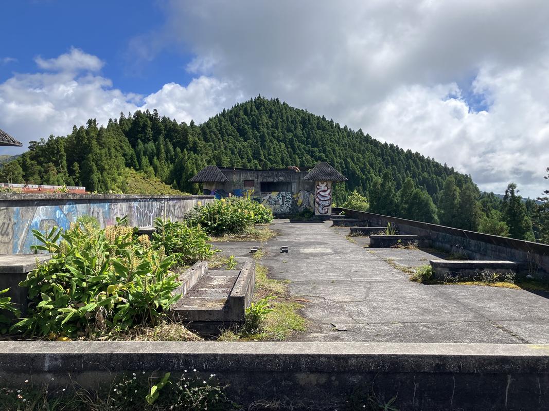 Historii a pohnutý osud hotelu podrobně popisuje web moraviantravelers.cz. Dnes opuštěný pětipatrový komplex měl 83 standardních pokojů, čtyři luxusní a jeden prezidentský apartmán, ale nebyl zde přístup na pláž, žádné sportovní vyžití nebo aspoň wellness. Každý z pokojů sice nabízí nádherný výhled, bohužel přes 200 dnů jej zakrývají mraky a déšť. My měli štěstí, nádherné počasí nám naservírovalo minimálně pětihvězdičkové obrázky sluncem zalitých Lagoa Azul (s modrým odstínem vody) a Lagoa Verde (zelený odstín). Zatímco barva Modré laguny vzniká odrazem oblohy v hluboké a čisté vodě, odstín Zelené laguny způsobuje zelená vegetace, která ji obklopuje, a částečně i minerály v její vodě rozpuštěné. Rozdíl je postřehnutelný a vyfotitelný pouze z dálky, a právě kvůli tomu sem míří davy turistů.