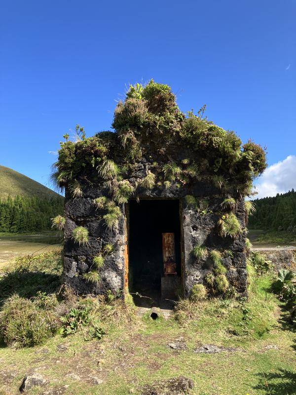 Vyrážíme po silničce podél akvaduktu, který kdysi převáděl vodu z horských zdrojů do Ponta Delgady. Jeho součástí je i několikapatrový objekt Muro das Nove Janelas (Zeď devíti oken), který údajně měl původně sloužit jako sklad pro nakládku a vykládku zboží z námořního obchodu a později prý jako lihovar. Mám sice dost bujnou fantasii, ale tyto funkcionality jsem si u tohoto objektu nějak neuměl představit. Jako mnohem pravděpodobnější vysvětlení mi přišla možná chyba v překladu, akvadukt mohl vodou zásobovat výše uvedenou infrastrukturu dole na pobřeží.