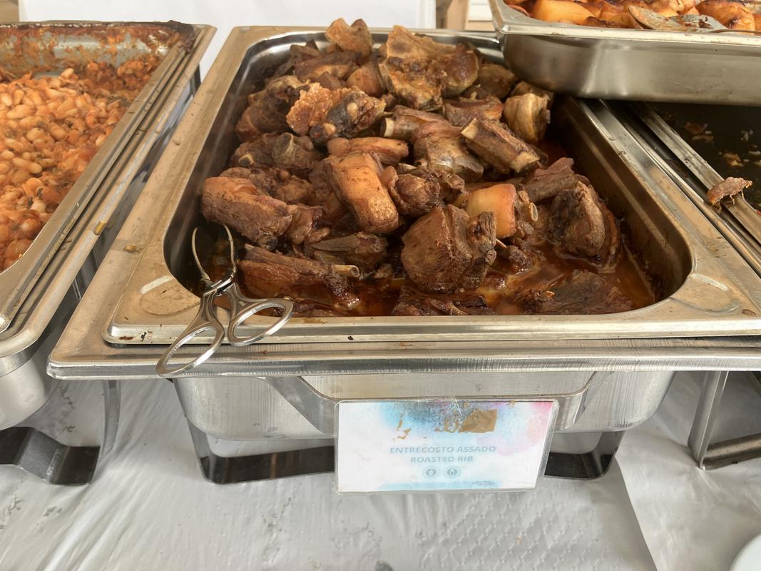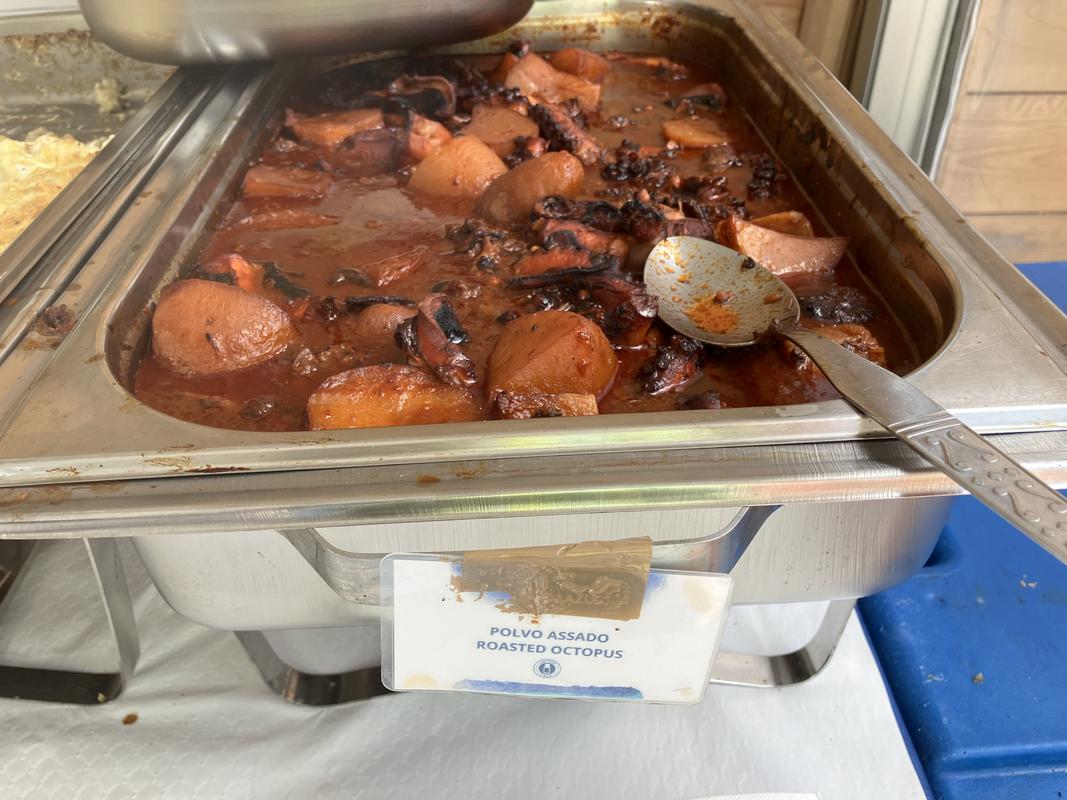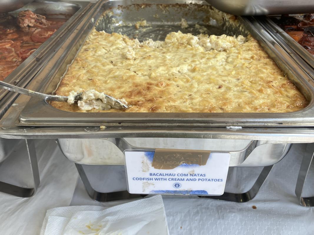Po prohlídce Monte Palace jsme si dopřáli krátké občerstvení ve stánku na parkovišti, následně jsme sjeli na oběd v Restaurante Lagoa Azul, jednom asi ze tří stravovacích podniků v Sete Cidades. Měli narváno, nám naštěstí Monča zařídila rezervaci. V ceně “All you can eat” (17 €) bylo jídlo dle libosti, jeden nápoj, zákusek a káva. Mne nejvíce oslovilo Bacalhau com natas (brambory zapečené se sušenou treskou, sýrem a bešamelovou omáčkou), dopřál jsem si také jiné chutné pokrmy. Můj záměr vyměnit kafe za druhé pivo u číšnice neprošel.