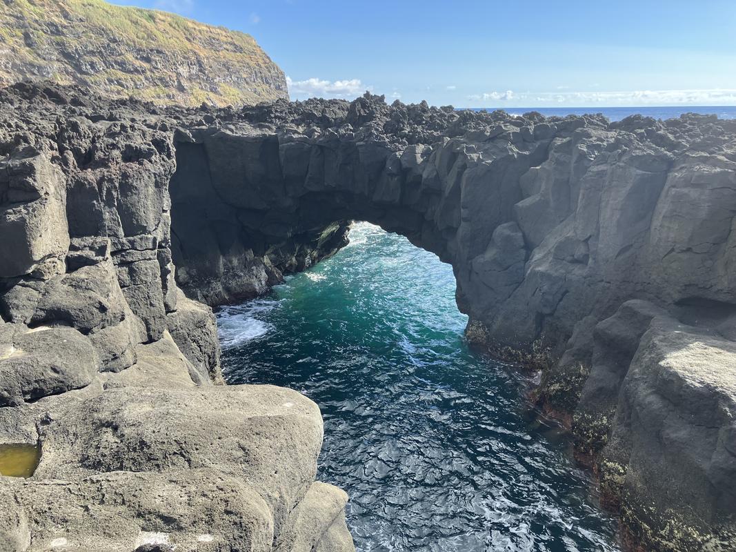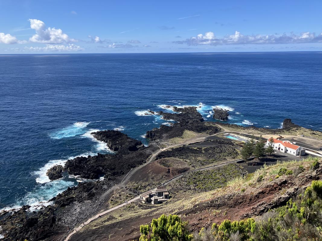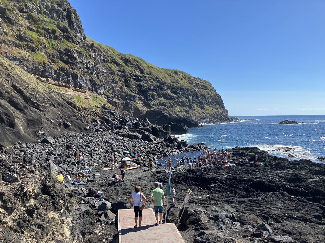 Koupaliště připomínalo hustě zaplněný lidojem, na jediný přístup po žebříku se stály fronty z obou stran. V částečně chráněné zátoce se dá koupat pouze za příznivých podmínek. V neděli 14. 9. 2025 měl příliv v Ponta Delgada vrcholit kolem 19:51 (úroveň hladiny 1.18 m), minimum odlivu nastalo ve 13:33 (hladina 0.54 m). My se trefili zhruba doprostřed intervalu mezi nejhorším stavem a optimem. I tak jsem se občas musel přidržet záchytného lana, aby mne vlny neodnesly do pryč. Voda byla překvapivě teplá. Vyzkoušel jsem i dva zbylé vybetonované bazénky, ještě teplejší.