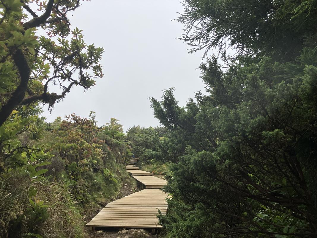Až do nadmořské výšky 1000 m se stoupá vysokým lesem, pak se krajina otevírá a závěrečný půlkilák vede po dřevem zpevněné stezce uprostřed horských keřů a bylin. Na vrcholu, který za pěkného počasí nabízí kruhový výhled na celý ostrov, jsme se zdrželi jen krátce. Kromě toho, že byl kompletně obklopen mračny, se tam ještě rojily divoké včely.