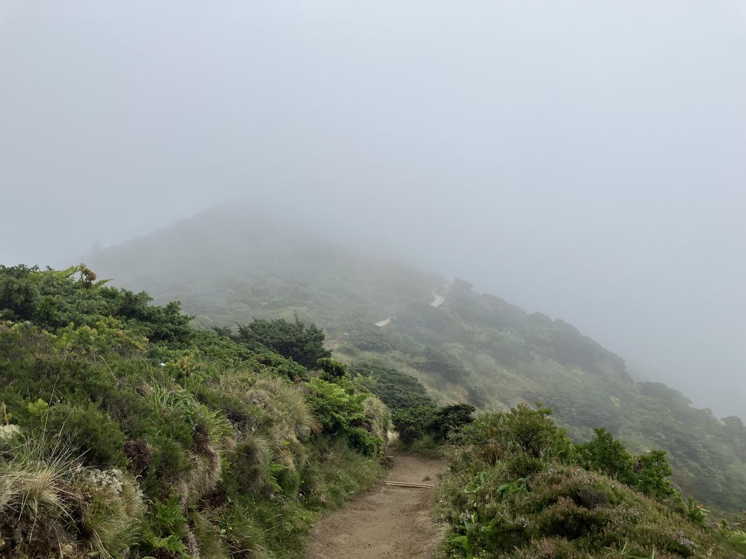 Špička kopce i během sestupu zůstala cudně zahalena závojem mraků, nesměle se nám ukázal aspoň oceán.