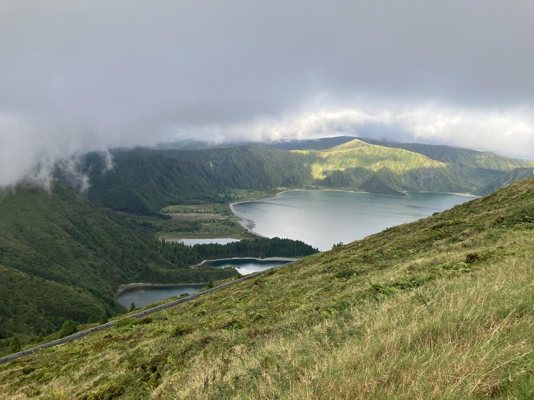 Jezero Fogo (Ohňové jezero) svými vodami zaplňuje dnes již vyhaslý a zelení obrostlý kráter vulkánu Água de Pau. Leží v nadmořské výšce 580 metrů (nejvýše položená laguna na Azorech), a zároveň je považováno za vůbec nejkrásnější jezero v celém Portugalsku. Na mé fotce vypadá jakoby slepené ze dvou různých vodních ploch, zelené a modré.