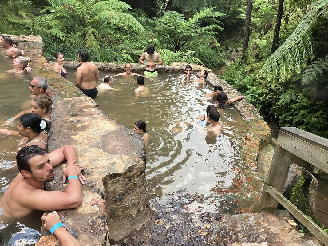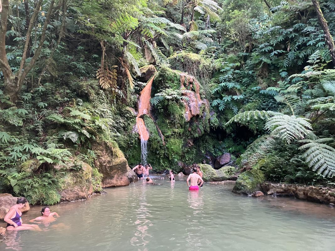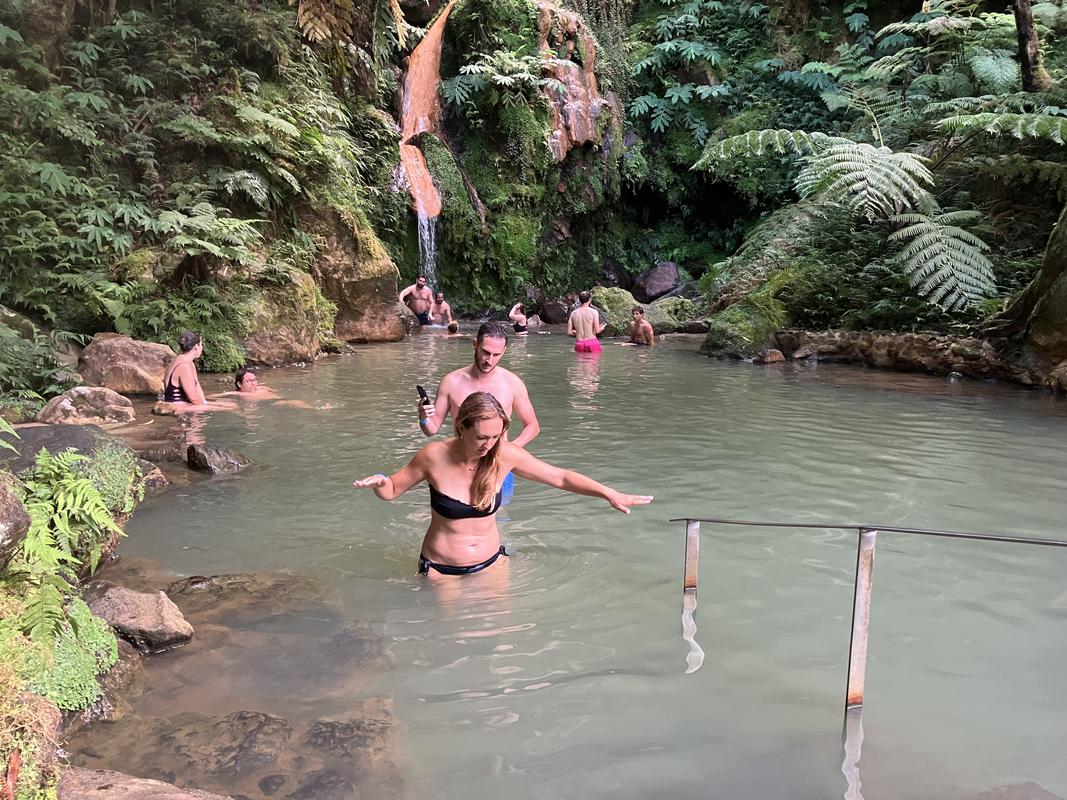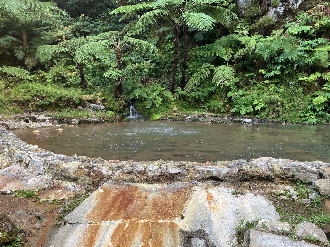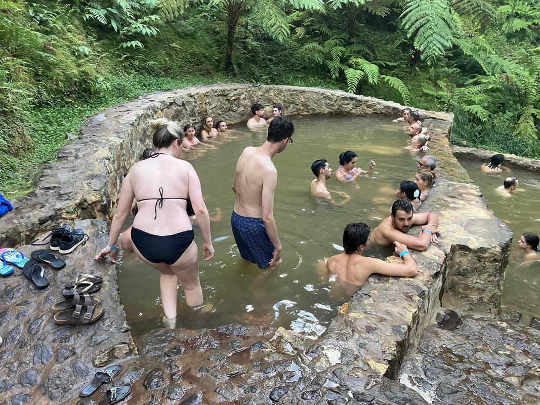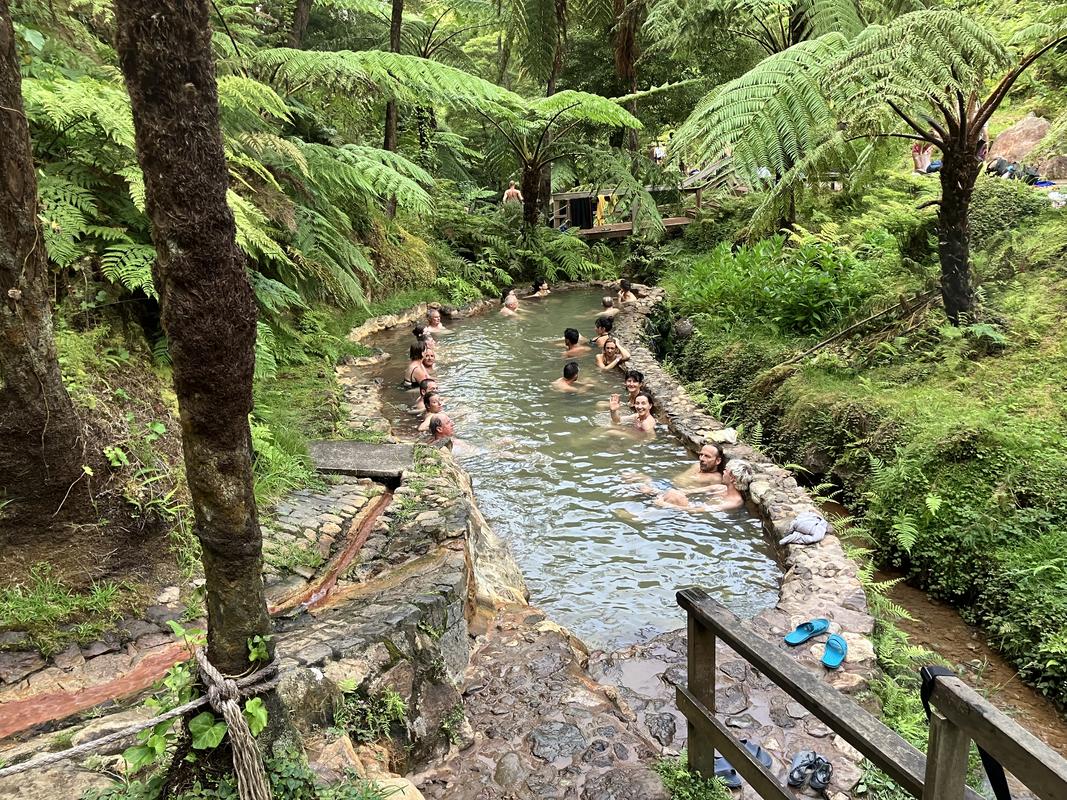 Po chvilce focení jsme sjeli serpentinami dolů k termálu Caldeira Velha, který je součástí stejnojmenné biosférické rezervace. Koupat se tu lze celoročně, doba návštěvy je časově omezena na maximálně 1.5 hodiny. Otevřeno mají denně od 9:00 do 19:30 (poslední vstup v 18:00). Cena včetně koupání činí 10 €, procházka po stezce vyjde na 3 €. Doporučuje se provést on-line rezervaci na webu národních parků. Vstupenku dostanete vždy na přesnou hodinu, případný pozdní příchod vám bez milosti zkrátí pobyt (kontrolují se různobarevné náramky na ruce).