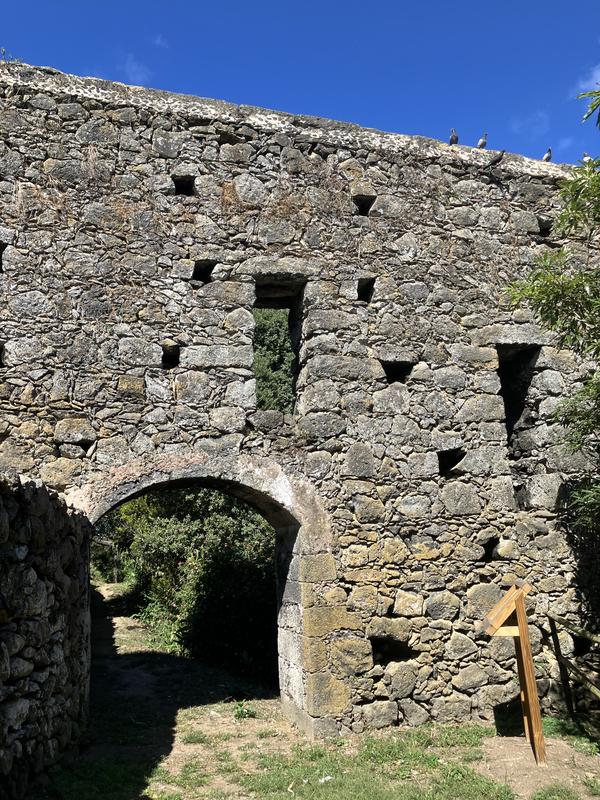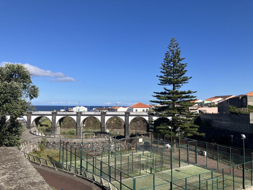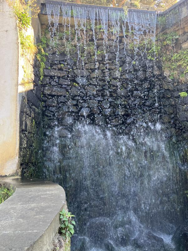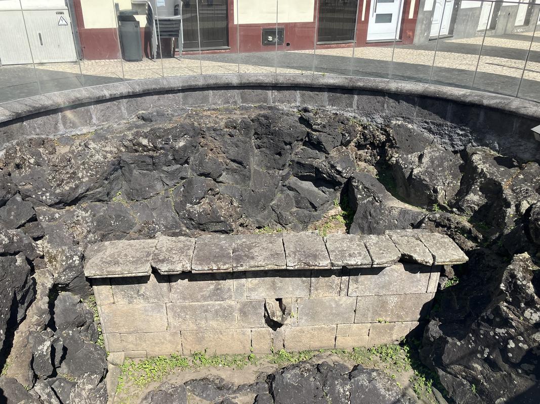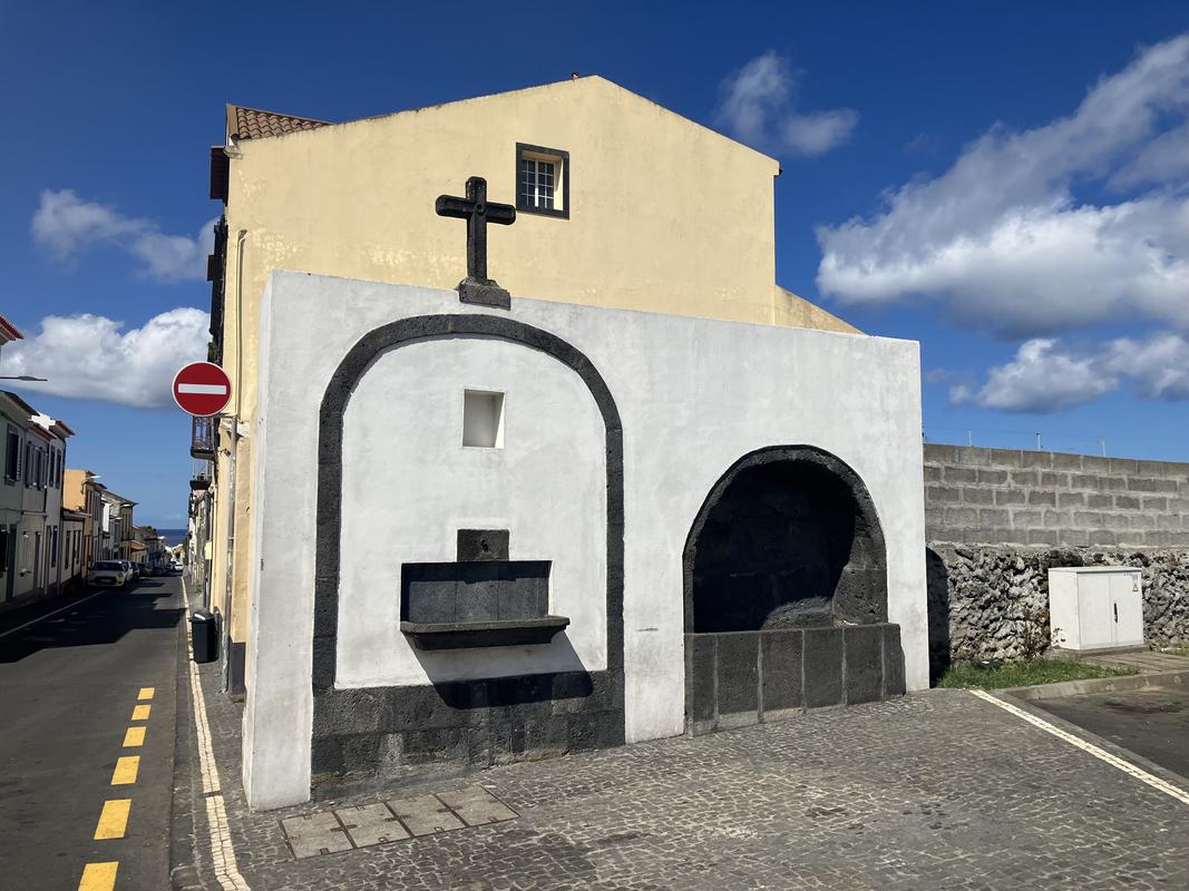 Po doplnění tekutin následoval seběh dolů do města. Vyfotil jsem si kapličku s bezvodým pramenem, voda nebyla ani ve fontáně Fontanário Antigo. Její nádrž totiž zcela zaplnila láva během erupci sopky Pico Queimado (dříve Pico do Sapateiro), ke které došlo v červenci 1563. Lávové proudy tehdy pohřbily část vesnice Ribeira Seca.