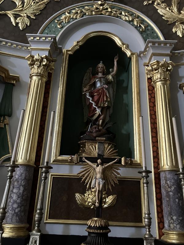 Prohlédli jsme si bohatě zdobený kostel P. Marie s hvězdou. Vystavují tam i poutní nosítka, mnohem menší a lehčí, než se používají při fiestách v Peru. Ohromil mne oltář s plastickým vyobrazením souboje, ve kterém Svatý Michael Archanděl poráží ďábla.