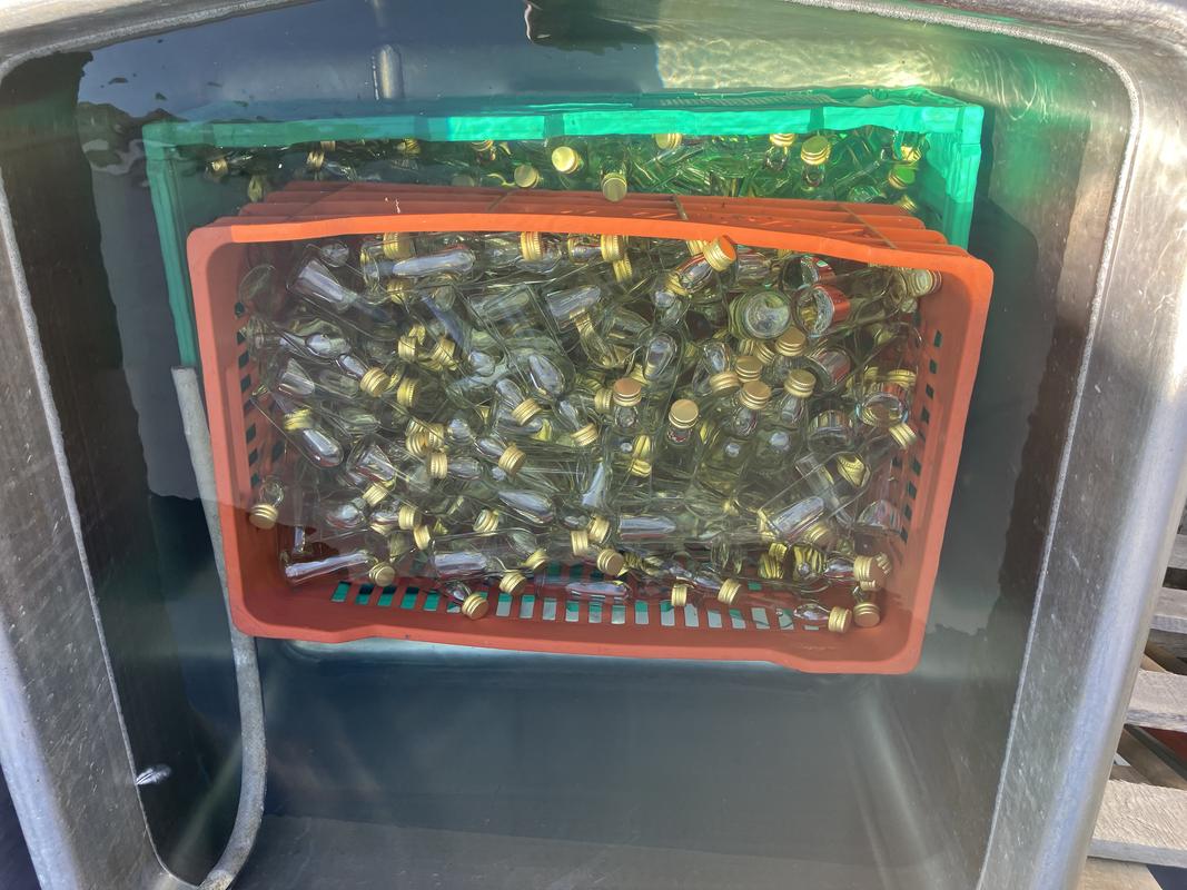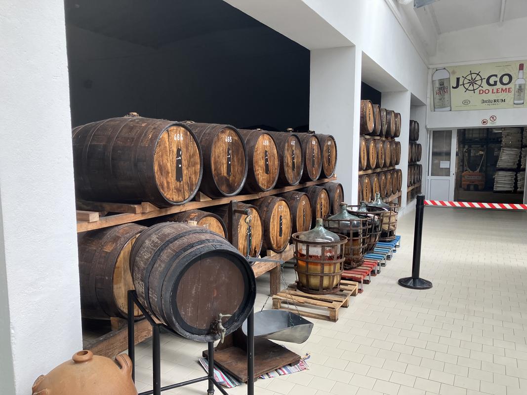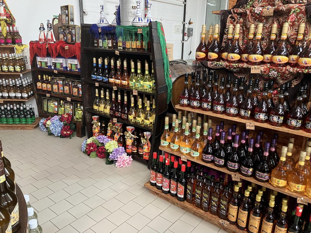 Naše kroky však vedly okolo záhonu s agávemi směrem k jiné pamětihodností, likérce Mulher de Capote. Tento rodinný podnik vyrábí pestrou paletu alkoholických nápojů z místních azorských plodů (mučenka, ananas, ostružiny, anýz…). Můžete si tam prohlédnout víceméně jen sklady, dají vám ochutnat všeho, o co si řeknete. Většina produkce je hodně sladká, nejvíc mi chutnal asi obyčejný rum. Na závěr jsem nakoupil zopár miniflaštiček vzorků jako dárky. Před barákem jsem si vyfotil bedny, ve kterých ležely asi prázdné lahvičky ponořené ve vodě.