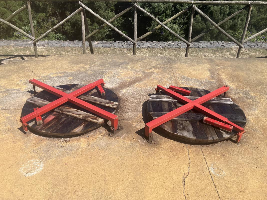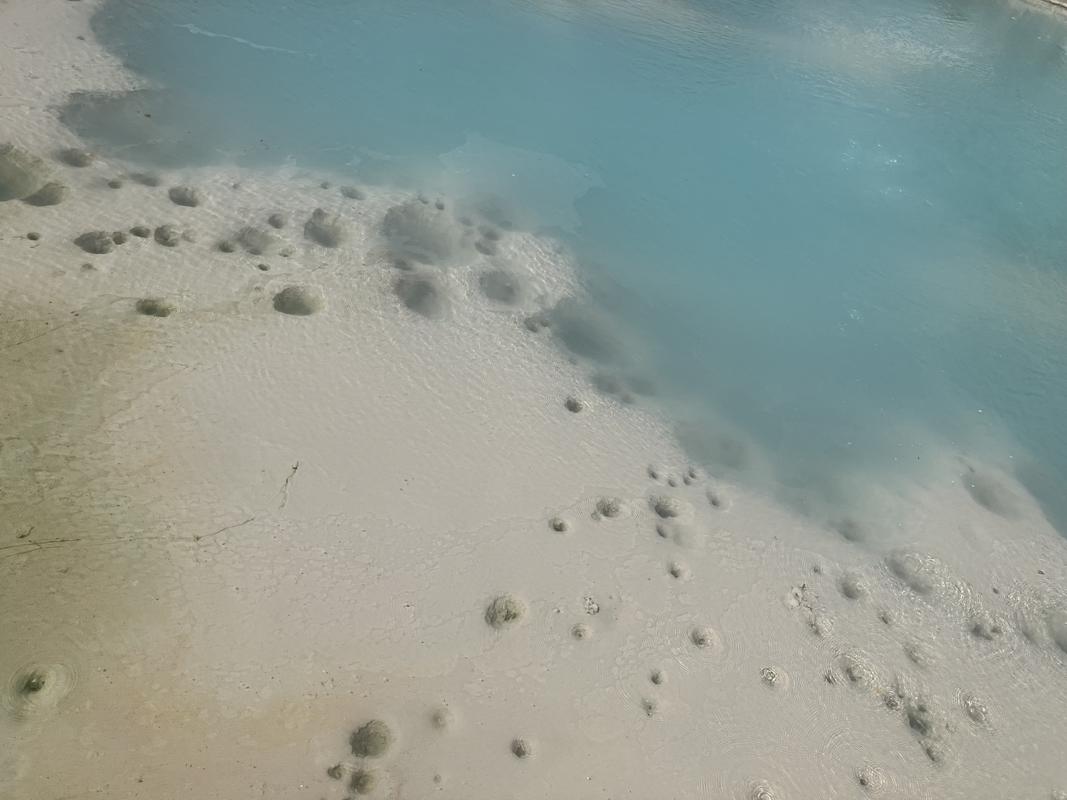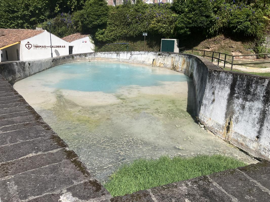 Přeběhnul jsem hlavní magistrálu do Lagoa a pokračoval ve stoupání po prašných silničkách, až jsem se dostal na asfaltku do Termas das Caldeiras. Panovalo strašlivé horko a nebylo se kam schovat. Na pití jsem měl litr a půl maracujové limonády Kima. Po vyndání z baťůžku mi pěkně vypěnila, ale naštěstí mi nezteplala. Kvůli vedru jsem ohřátí v termálu oželel, jen jsem si tam vyfotil bublající jezírka a poklopy, které zakrývají Caldeiras de Cozido, které zjevně slouží ke geotermálnímu ohřevu stejnojmenného pokrmu.