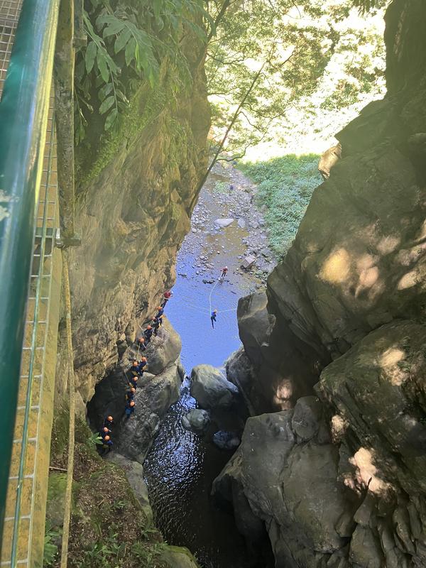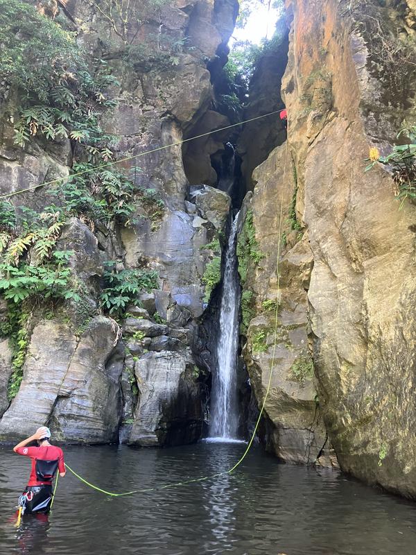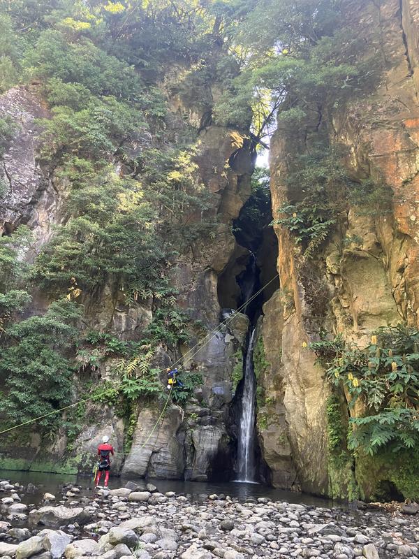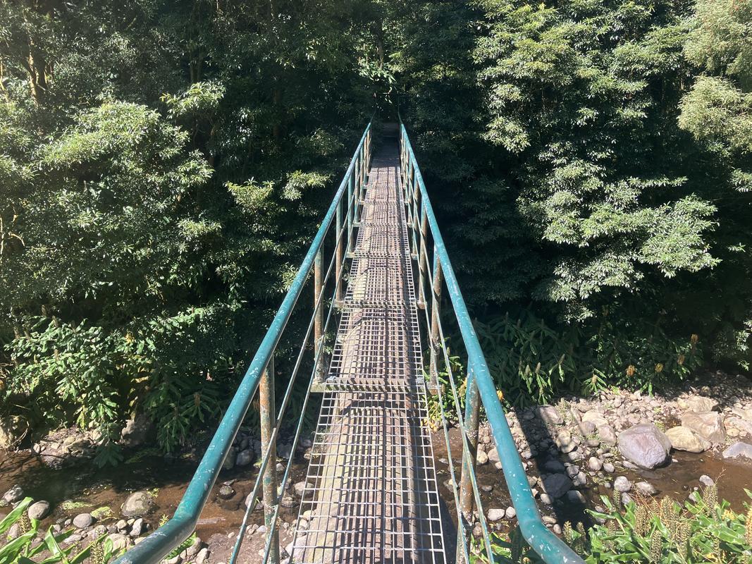 Čekalo mne ještě krátké stoupání k turistickému rozcestníku, pak už to se mnou šlo z kopce. Proti mně kráčely hloučky dívek v přilbách, bikinách a polosundaným neoprenem. Pomyslel jsem si, že se asi vrací z nějakého canyoningu. Minul jsem zařízení na odplyňování CO2 a poté se dostal k budově hydroelektrárny da Fajã Redonda. Od ní trasa vedla nad nebo vedle potrubí spádové vodní elektrárny až do soutěsky vodopádu Salto do Cabrito. Tam jsem pochopil, že neoprenové víly se vracely ze slaňování vodopádu. Následoval sestup po dlouhých prudkých schodech pod Salto do Cabrito.