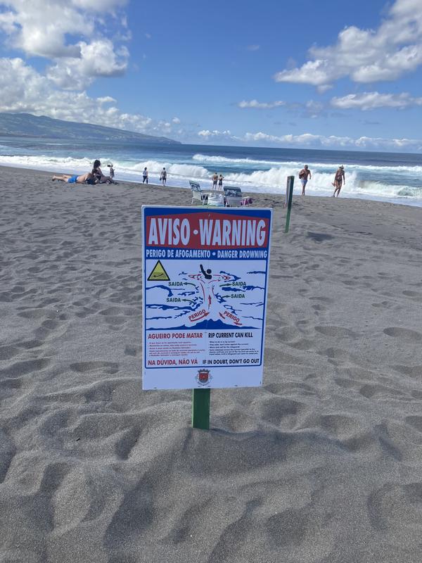 Koupání je dovoleno pouze v úseku vyznačeném dvěma cedulemi, jinde hrozí, že vás silné zpětné proudy zanesou na moře. Dodržování nařízení hlídá několik plavčíků, i když jednoho jsem vyfotil, jak si místo sledování pobřeží hraje s mobilem.