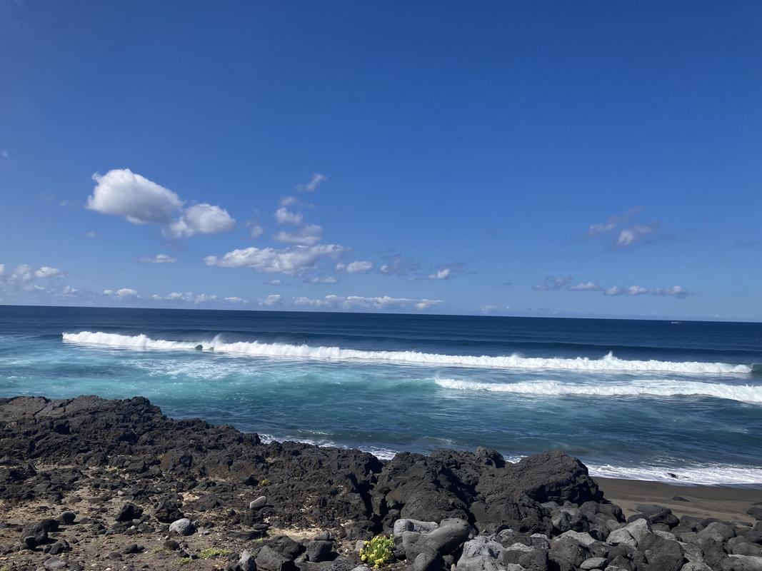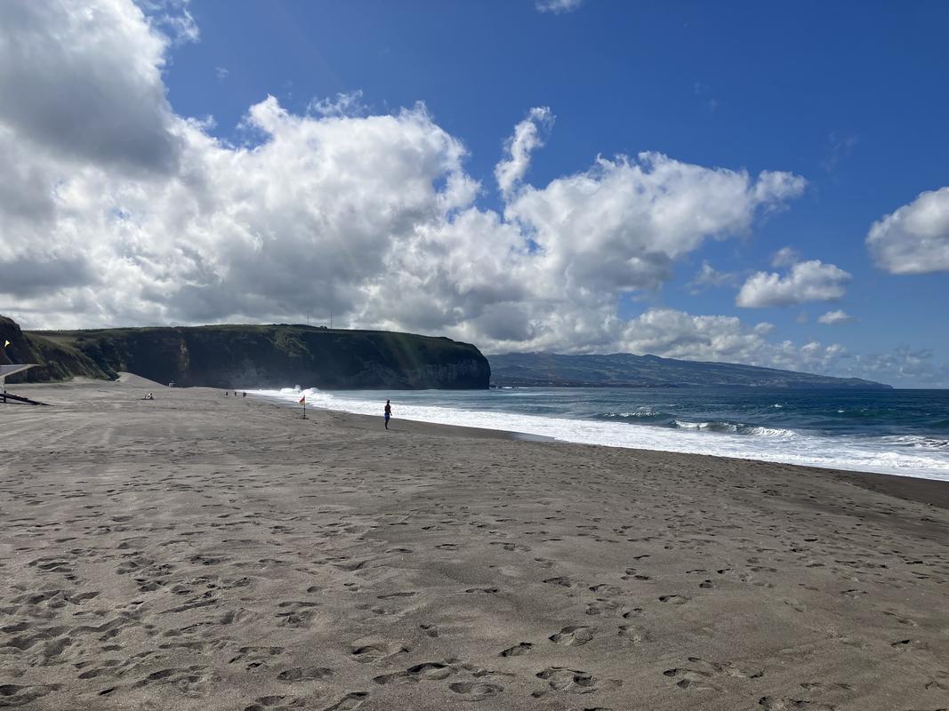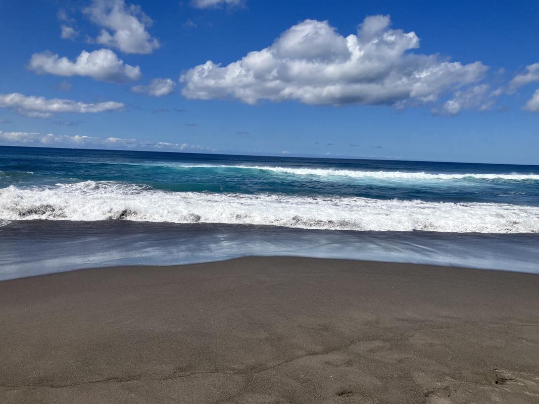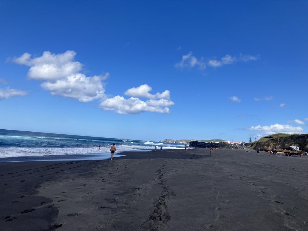 Chvalozpěvy na tuto pláž nelhaly, kontrast úžasně modrých vln s černým pískem je děsně fotogenický. Zul jsem boty a ponožky, abych neměl písek všude. Po pár krocích jsem toho litoval, bosá chodidla na sluncem rozpáleném písku docela trpěla. Naštěstí mne napadlo popojít blíž k moři a využít vlnami chlazený povrch pobřeží.