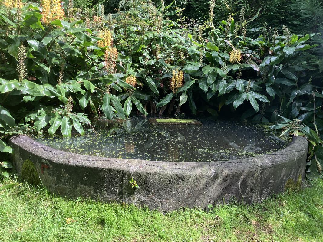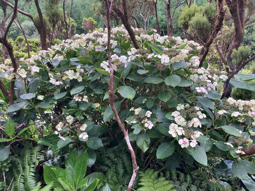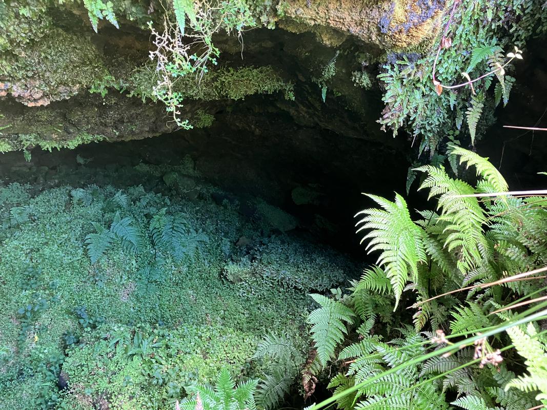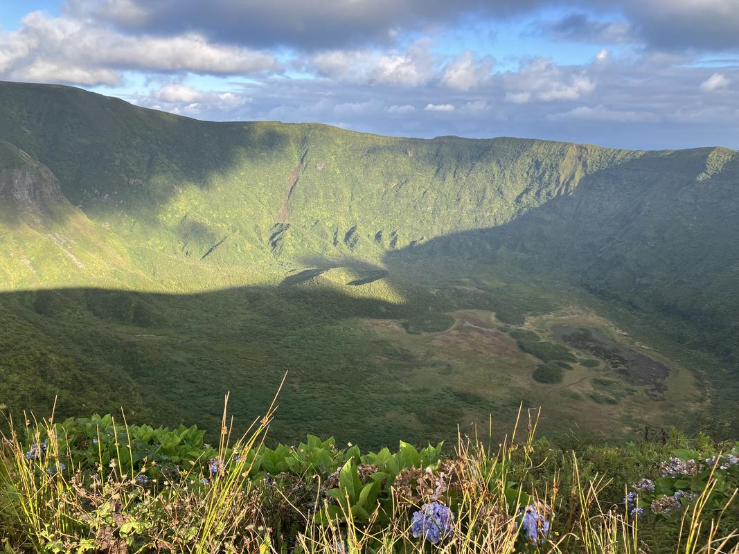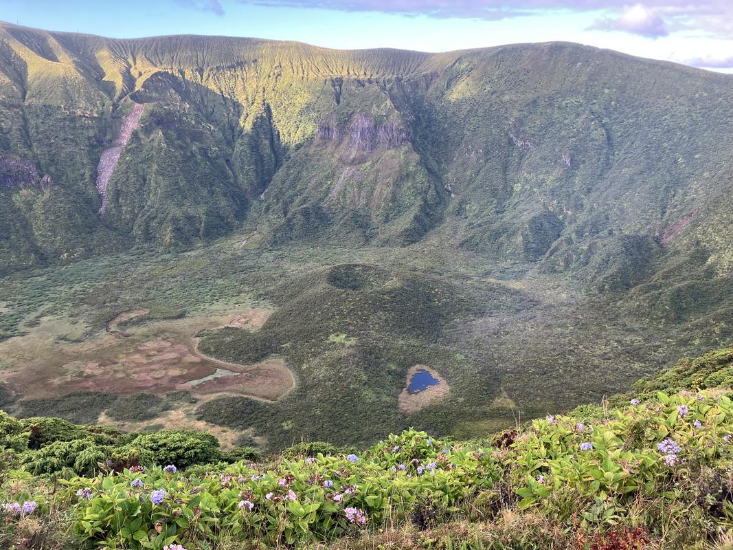 Míjíme malou jeskyňku, fotím si zajímavý průhled na moře, hortenzii velkolistou a napajedlo v sedle mezi vulkány Cabeço Verde a Cabeço do Fogo.