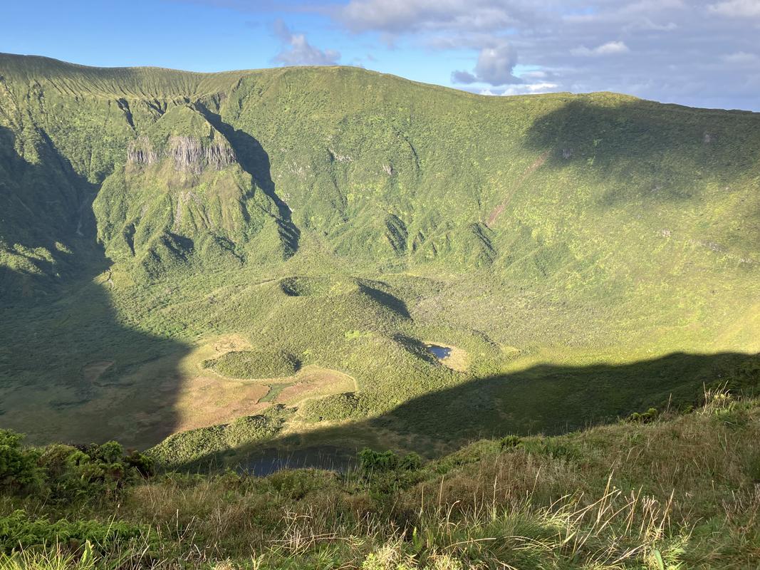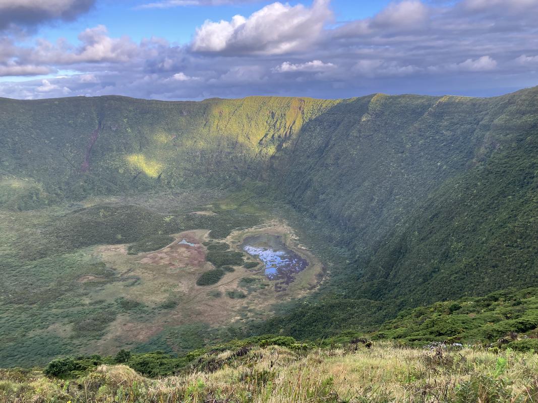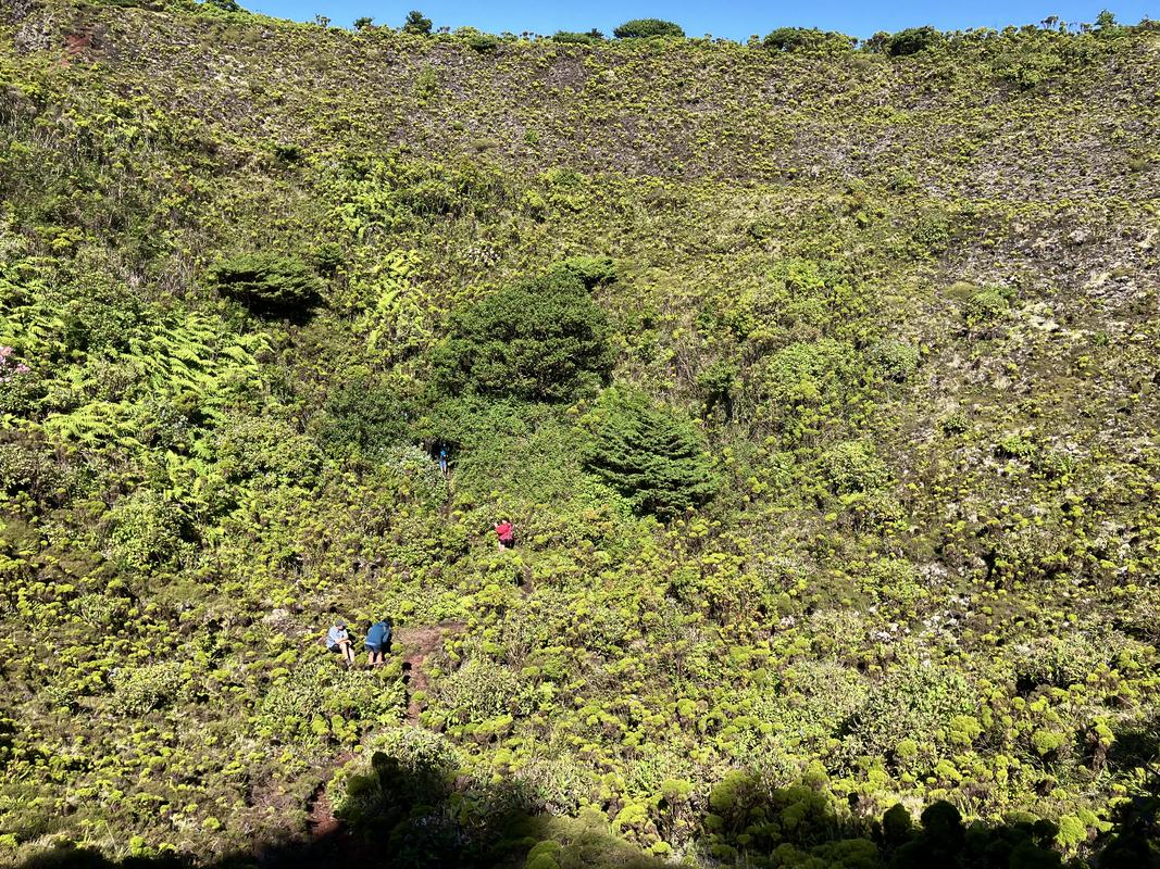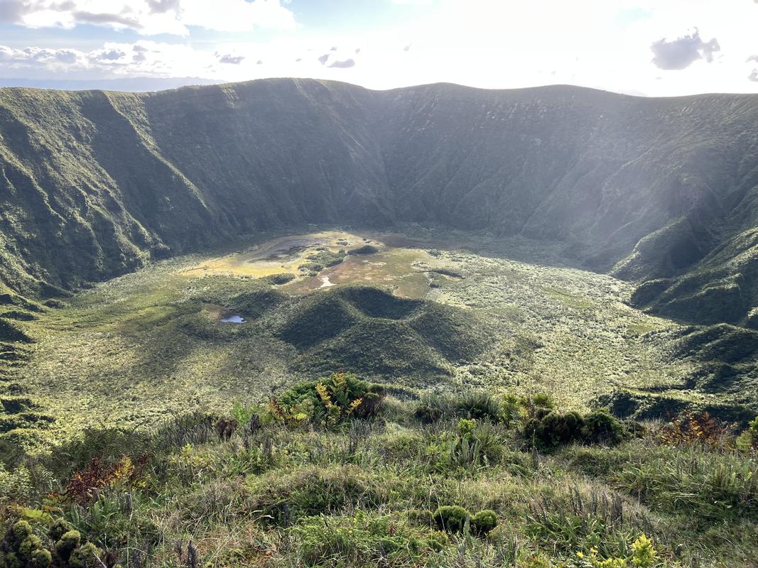 Počasí nám přeje. Výhledy dolů do hlubokého kráteru jsou vskutku impozantní, jeho dno zdobí několik jezírek/bažinek, nad kterými ční půvabný sopečný kužílek.