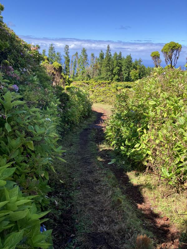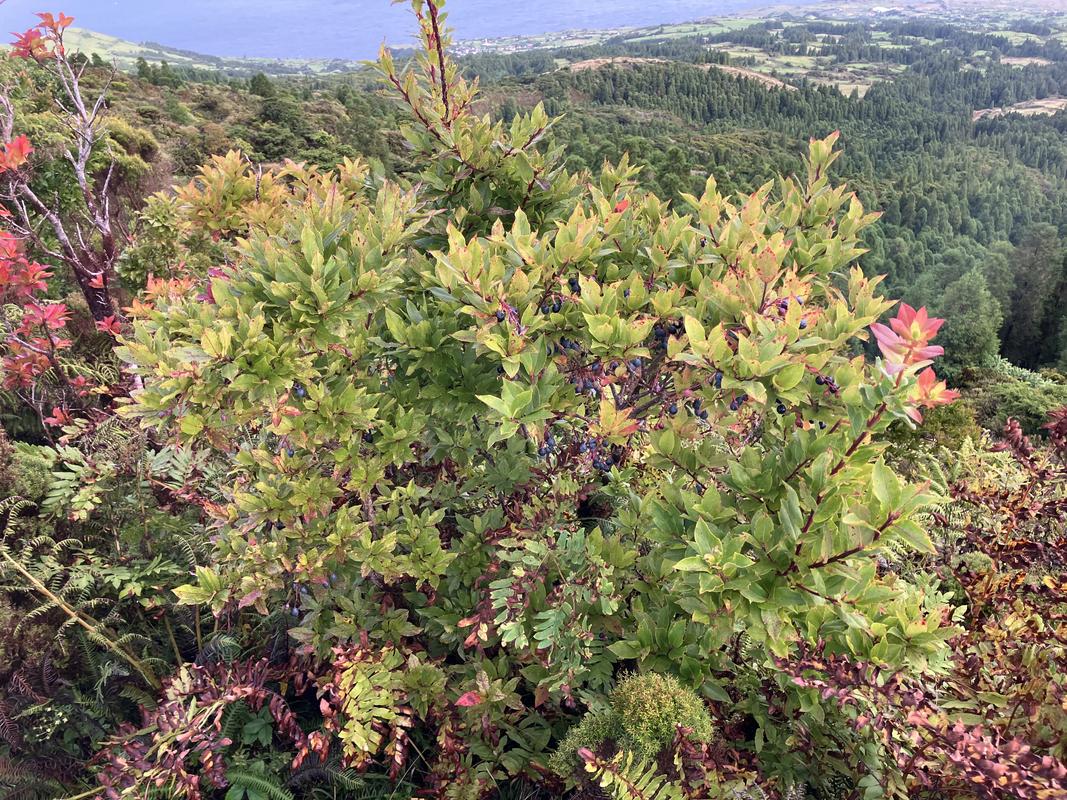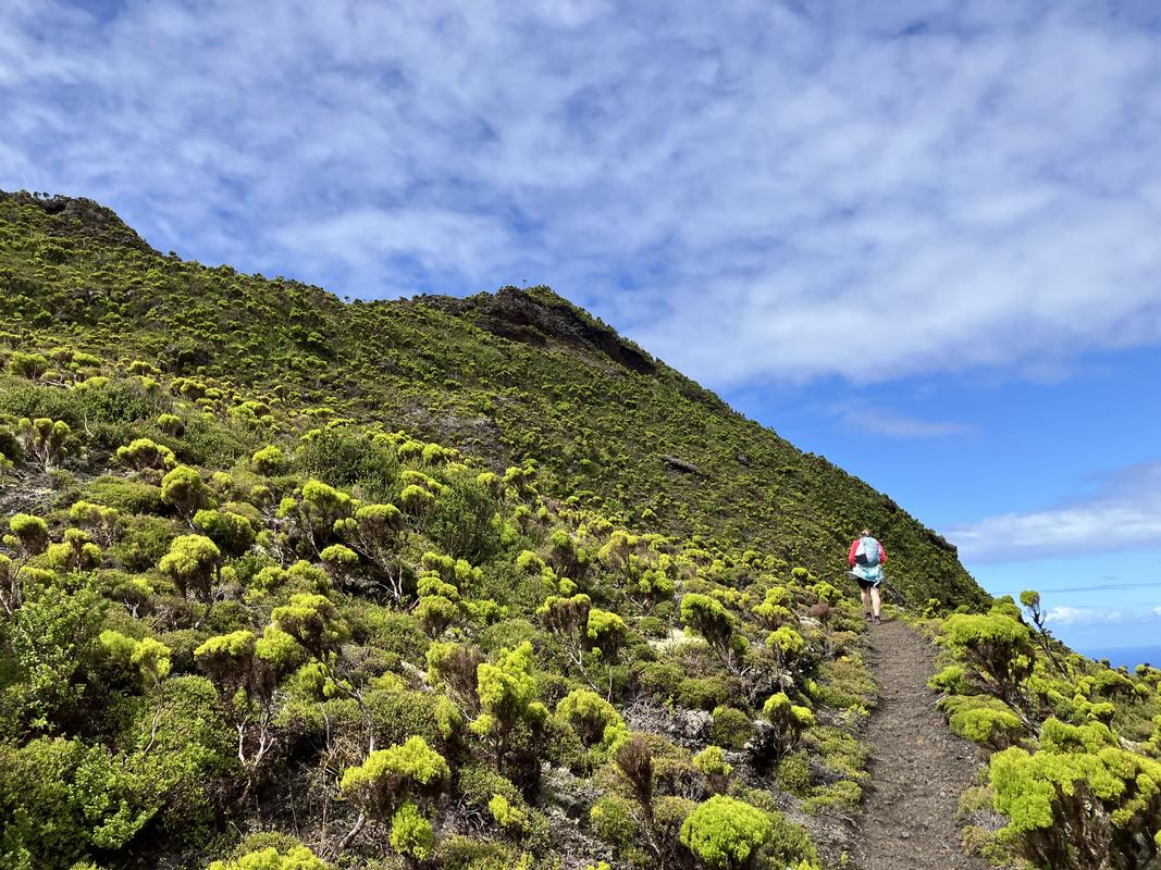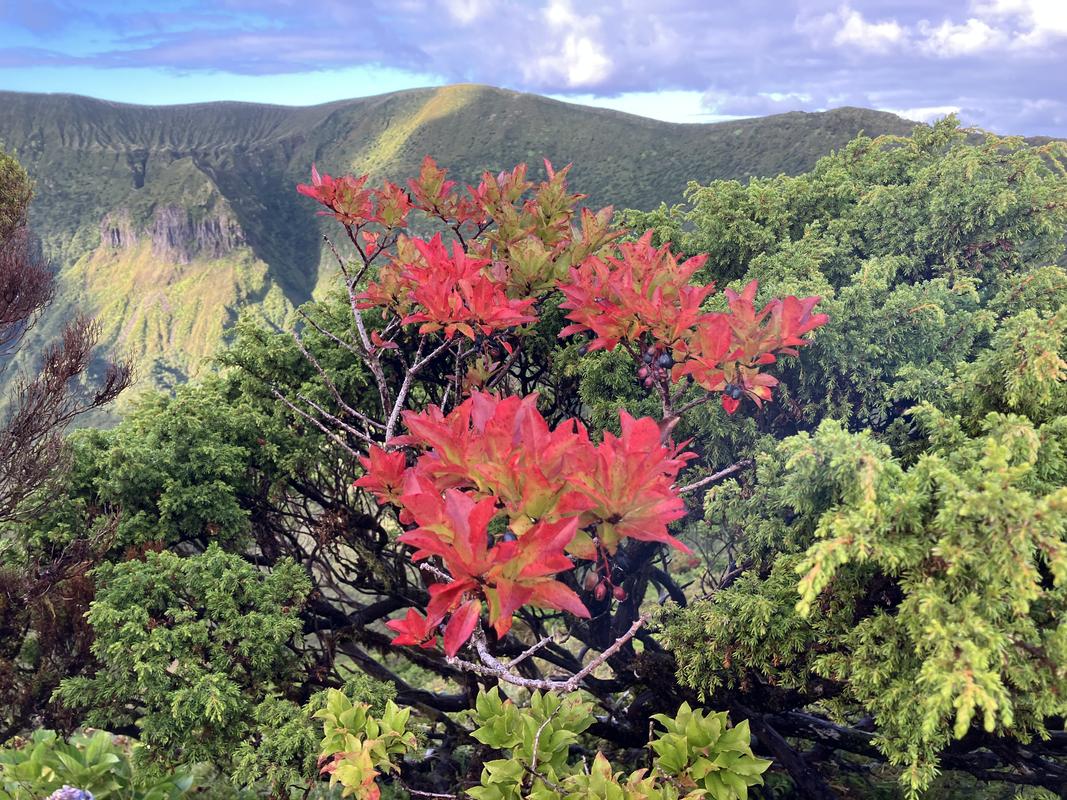 Obcházíme sopouch po pěšině obklopené místními křovinami a vřesy a poprvé ochutnáváme plody azorské borůvky.