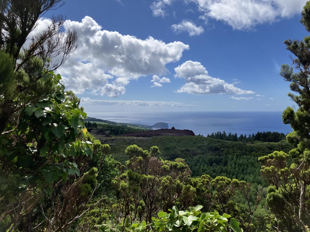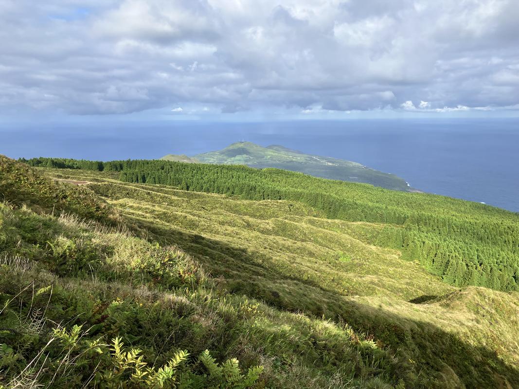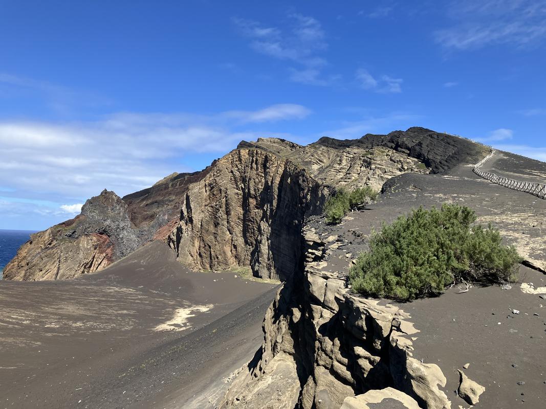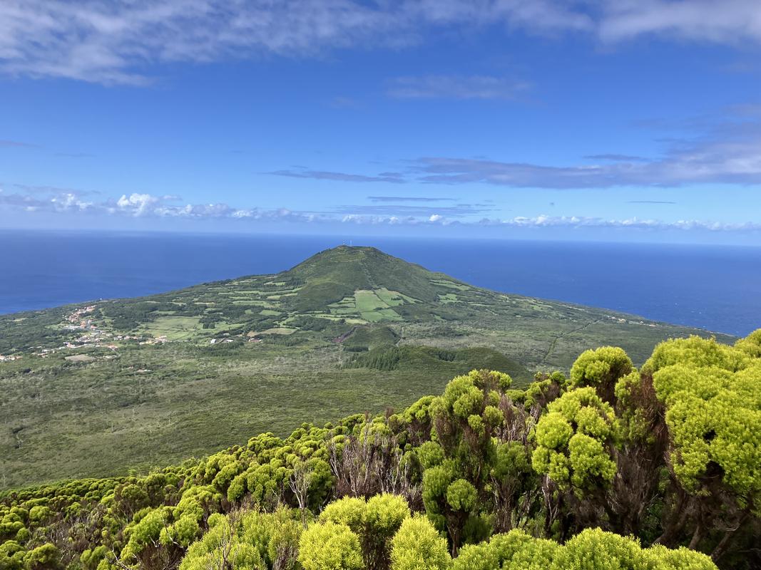 Následuje prudší výšlap na vrchol Cabeço do Fogo s výhledem na Cabeço Verde a Cabeço do Canto nad sopkou Capelinhos.
