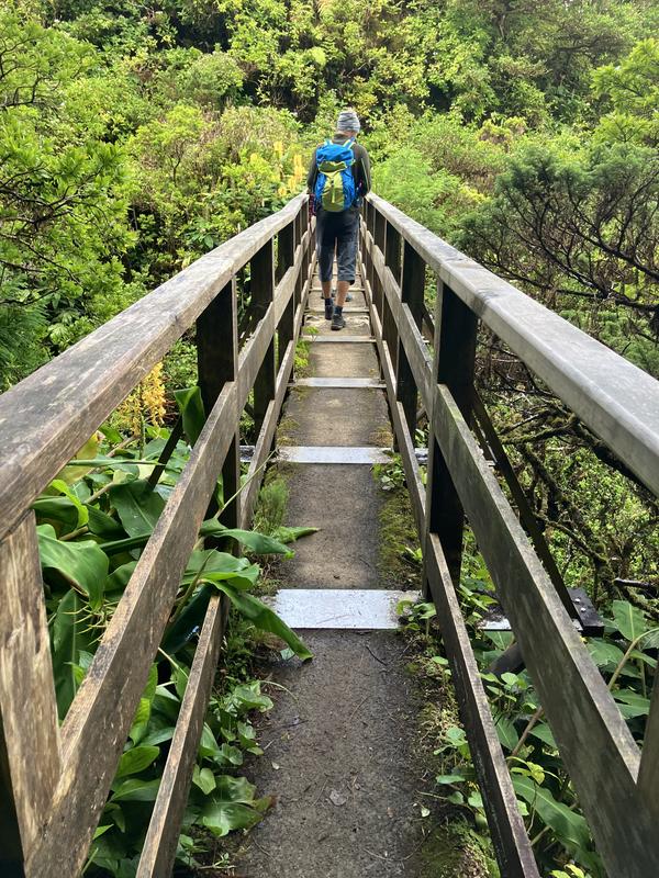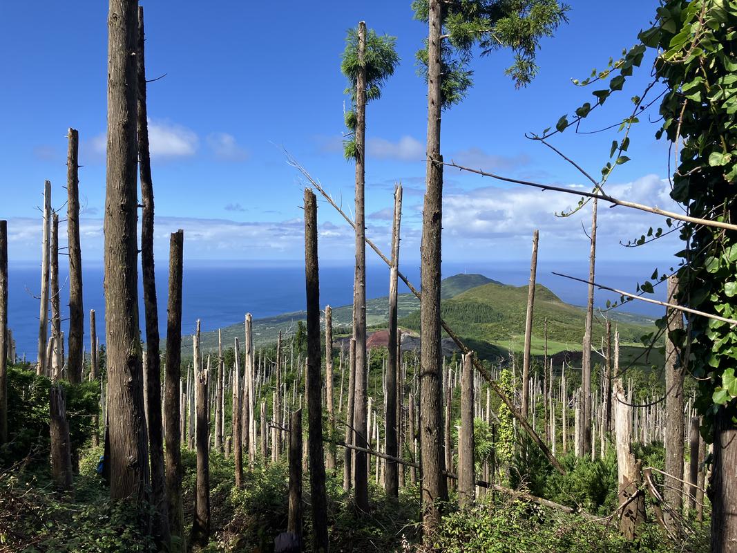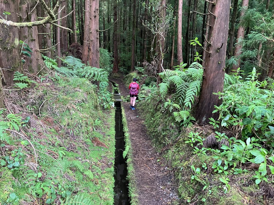 Vzápětí klesáme po stezce, kterou občas zpevňují schody a míříme k silničce Caminho Florestal da Caldeira. Odsud už je to jen kousek do cíle v Parque Florestal do Capelo. Jedna spolucestující kvůli problémům s koleny volí postup po asfaltu, já spěchám po lesní cestě, víceméně z kopce.