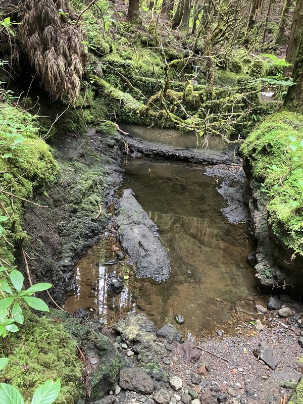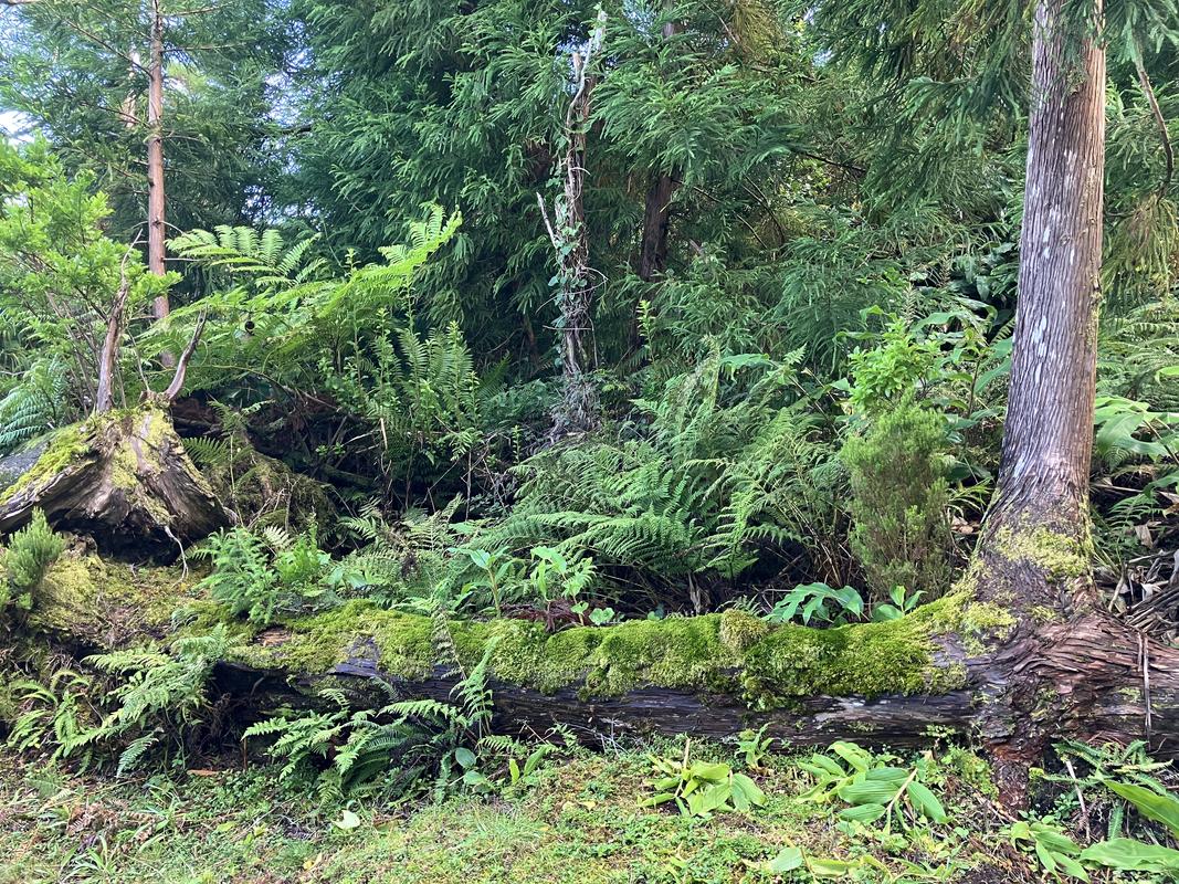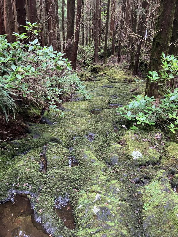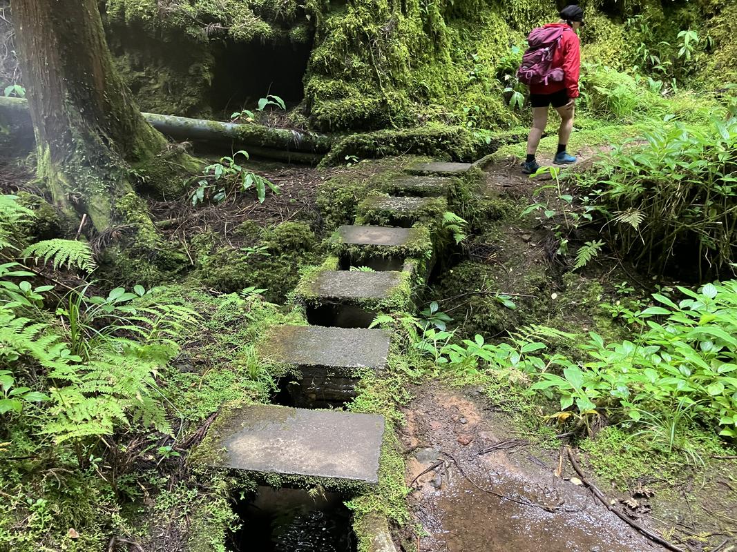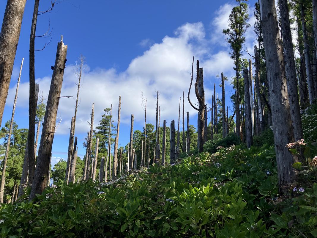 Musíme se vrátit zpět na rozcestí u nádrže, já volím okliku přes římsu kráteru, zacházka je to minimální. Při sestupu mezi křovinami borůvek a hortenzií mne zaujalo několik dendrologických zajímavostí. Nejprve fotím polomy skoro jak u nás doma, a hned nato mne zaujal zajímavý úkaz stromu, který vyrůstal přímo z kmene svého padlého předka.