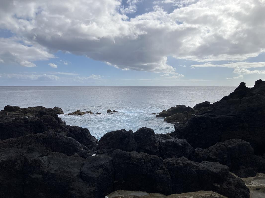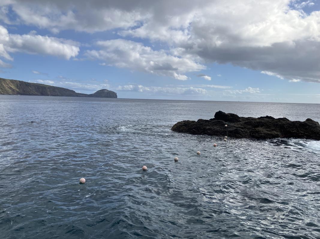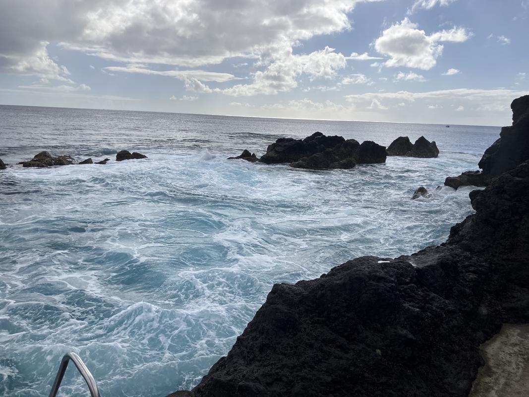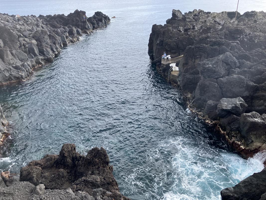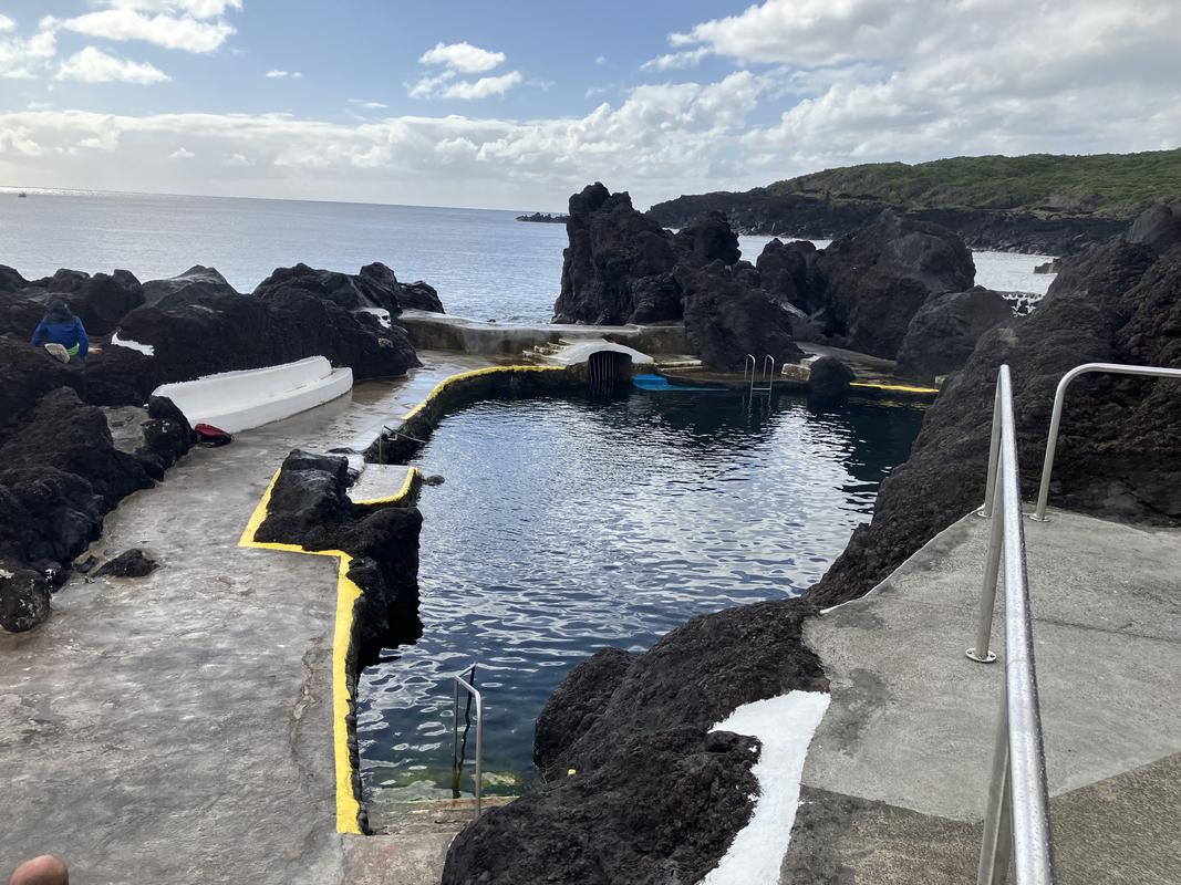 Do Varadouro je malá zátoka, oddělená od oceánu několika čedičovými skalkami. Ty koupaliště chrání před vlnami, ale jen do určité míry. My tam zrovna potkali docela mohutný příliv a silné vlnobití. Při pohledu na vzduté moře se nám do vody moc nechtělo. Nakonec několik z nás našlo odvahu, a nelitovali jsme. Voda byl překvapivě teplá. Občas sice přišla velevlna, která si se mnou pohrála, jak chtěla, ale většinou stačilo jen trošku máknout a člověk zůstal víceméně na místě. Takový plavecký trenažér :-).
