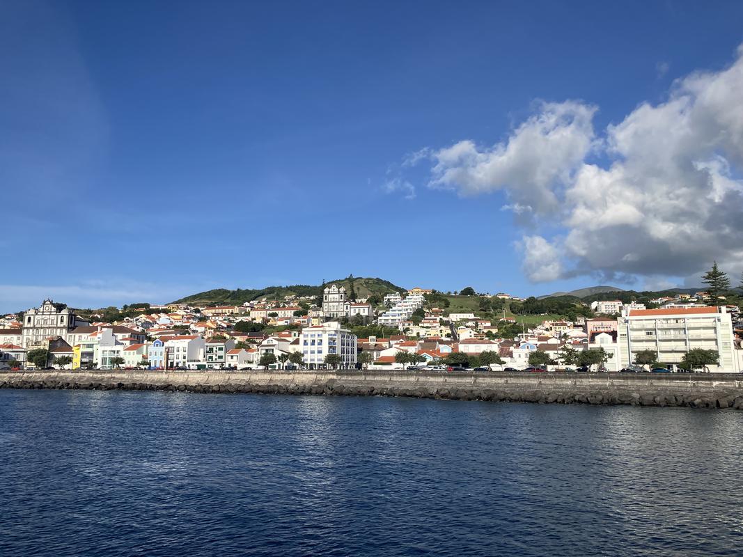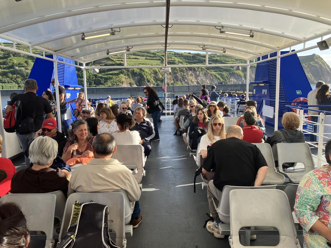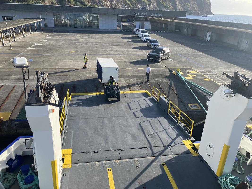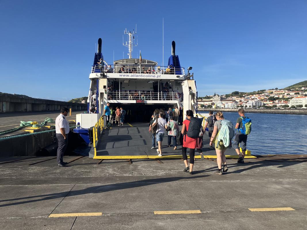 Po snídani vyrážíme se všemi zavazadly do přístaviště Horta, odkud vyplouvají trajekty na ostrov Pico. Naše velká zavazadla musíme podat jako na letišti, na trajekt je nakládají pomocí kontejneru, taženého čtyřkolkou.