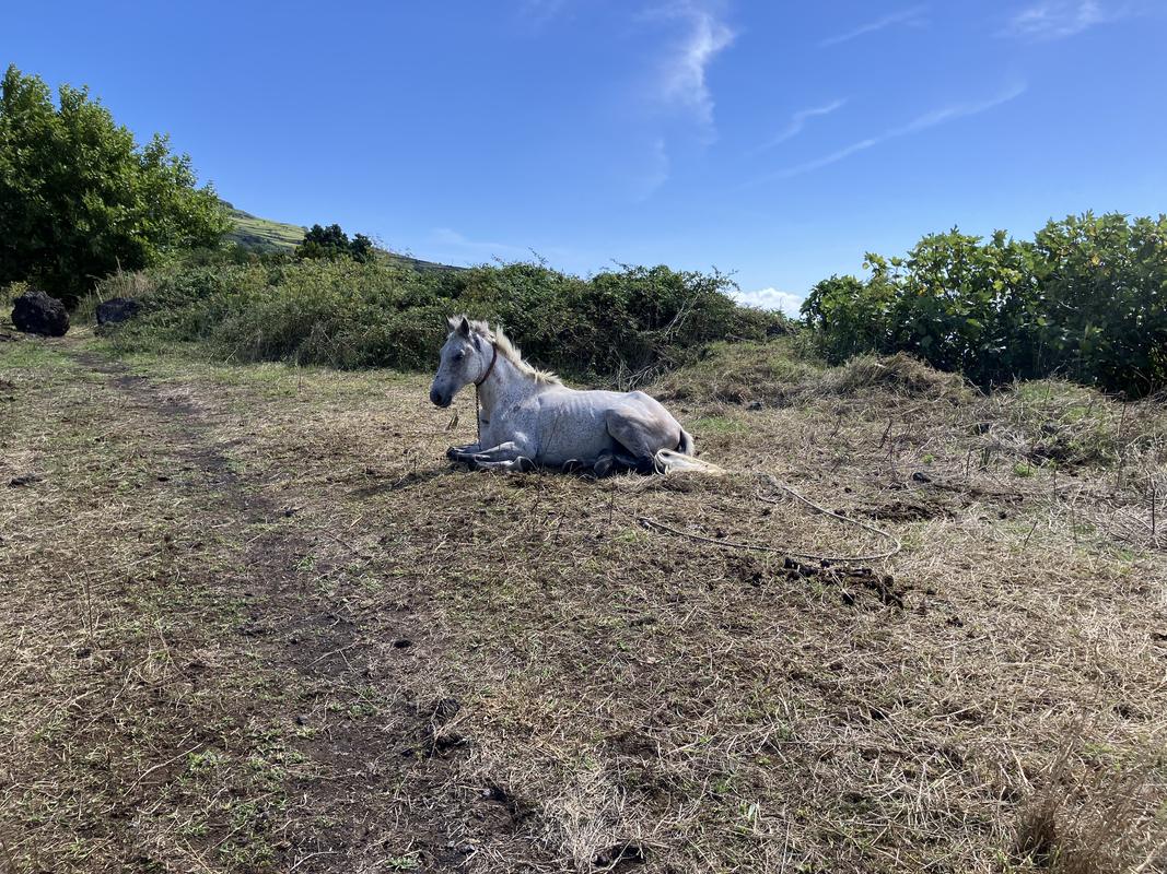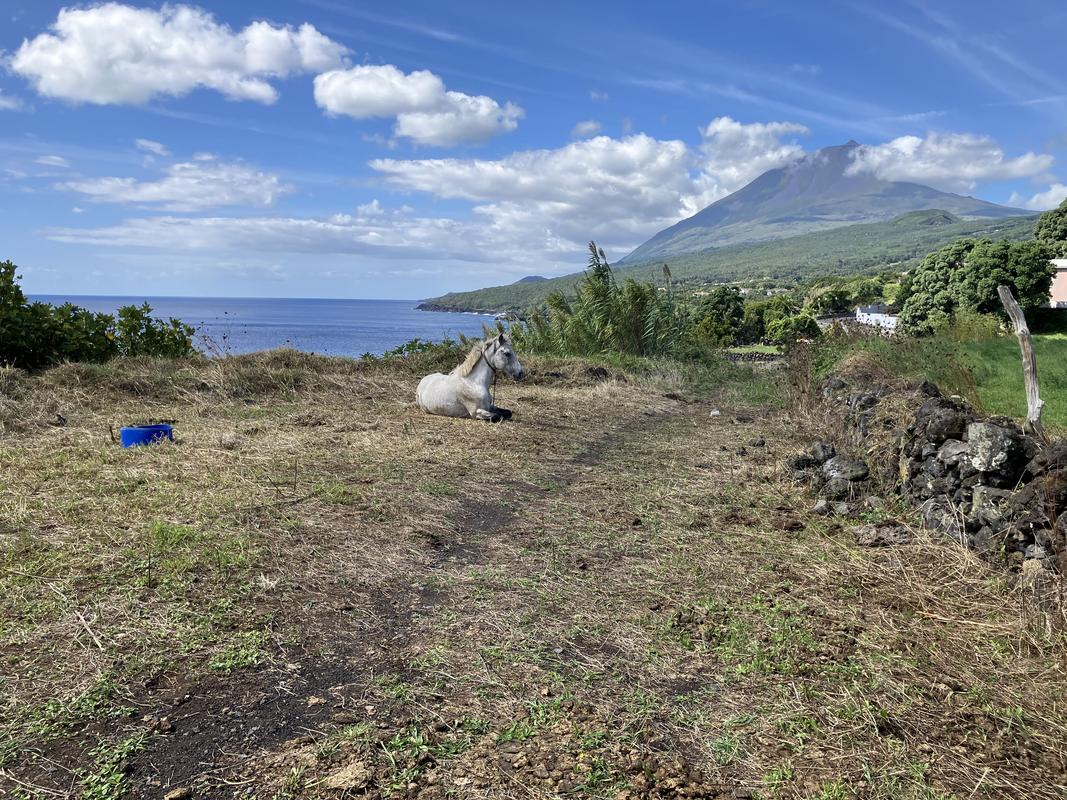 Trasa vedla převážně po silnici, ale občas mne zavedla i na boční cestičky. Na jedné z nich jsem potkal ležícího koně. Když mne uviděl, zkusil se vztyčit, ale zvládnul to jen částečně. Kousek od něj jsem vyfotil Pico v závoji mráčků.