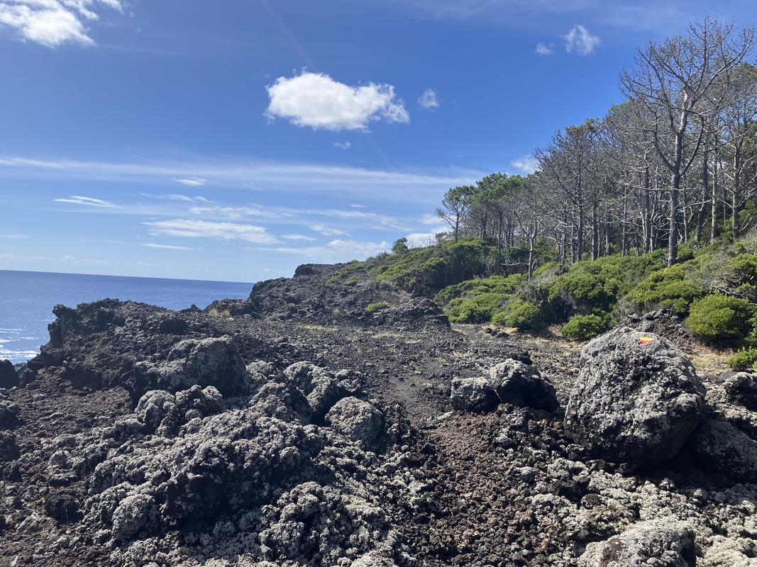 Značka po chvíli odbočila na lávová pole těsně nad pobřežím oceánu. Narušená krusta ztuhlého magmatu není zrovna ideálním běžeckým povrchem, boří se a ujíždí pod nohama. Sice mne v tu chvíli napadla lehce sebekritická veršovánka: “Po lávovém poli, běhají jen voli.”, ve skutečnosti jsem byl z výklusu po vulkanických horninách nadšen.