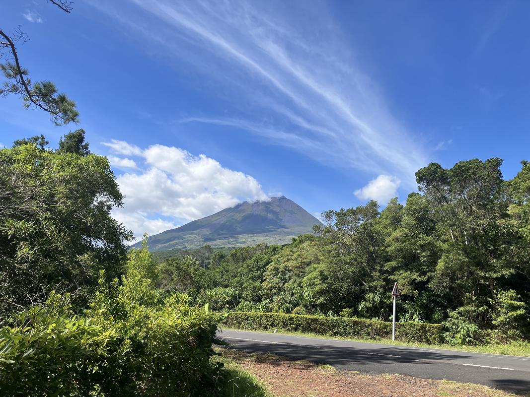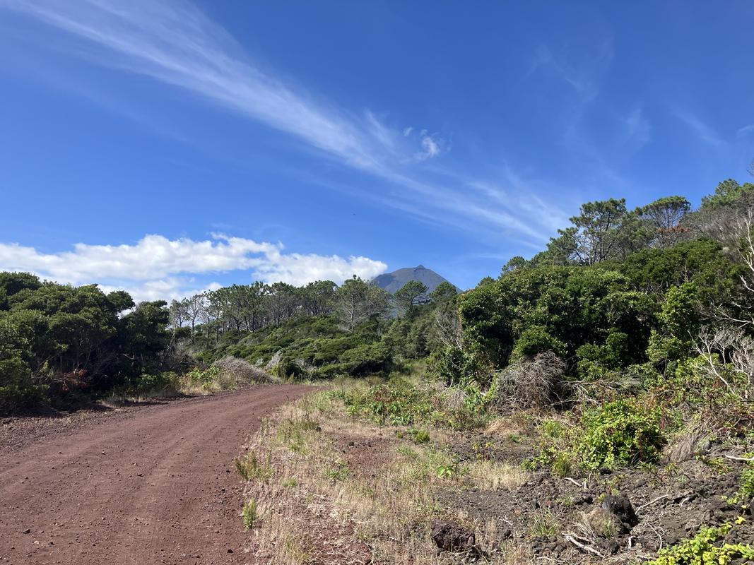 Stezka se zas vrátila na prašnou silničku a dovedla mne až ke křižovatce s hlavní silnicí a výhledem na Pico, kde jsem se obrátil a běžel zpět.
