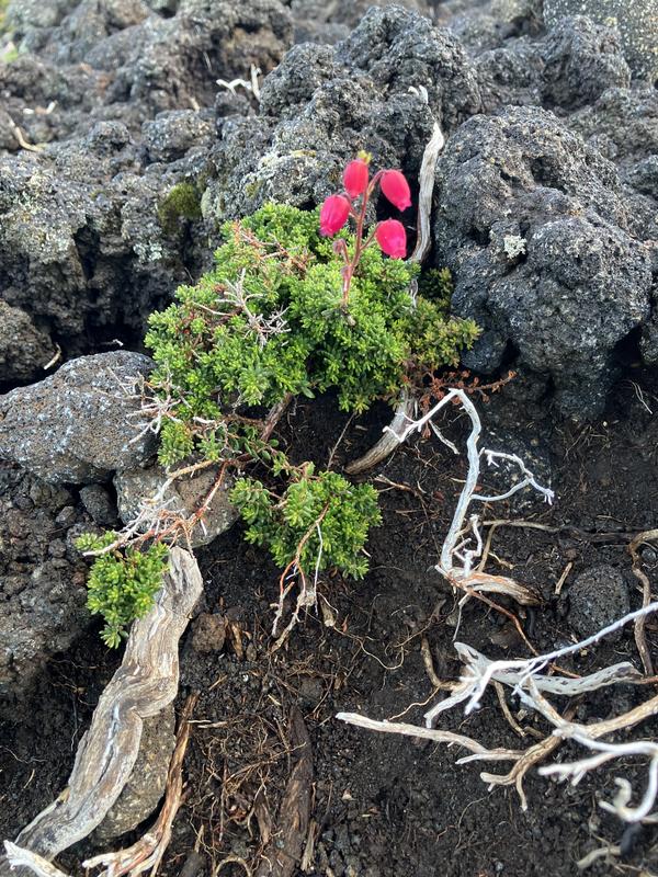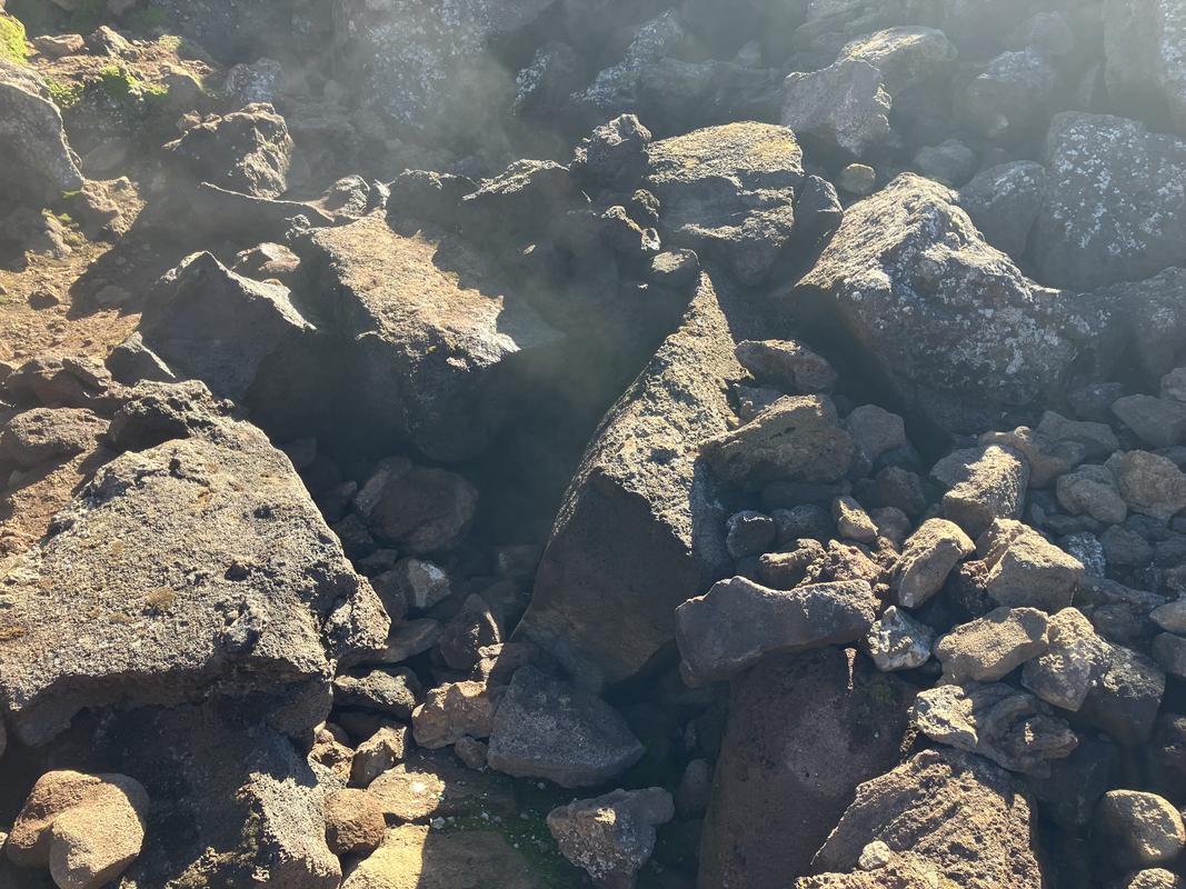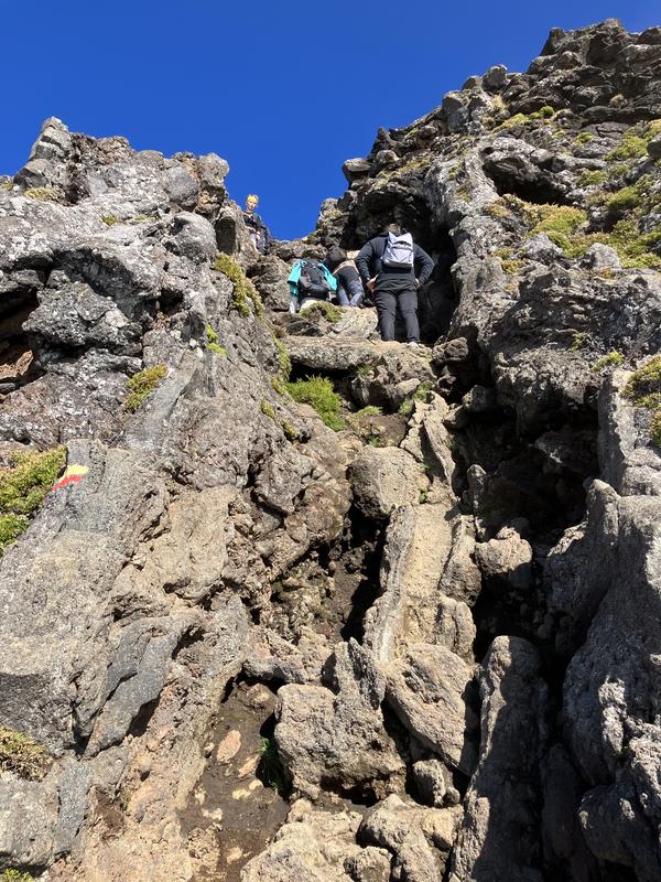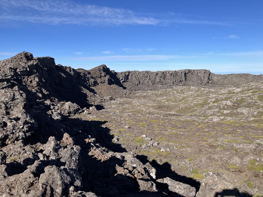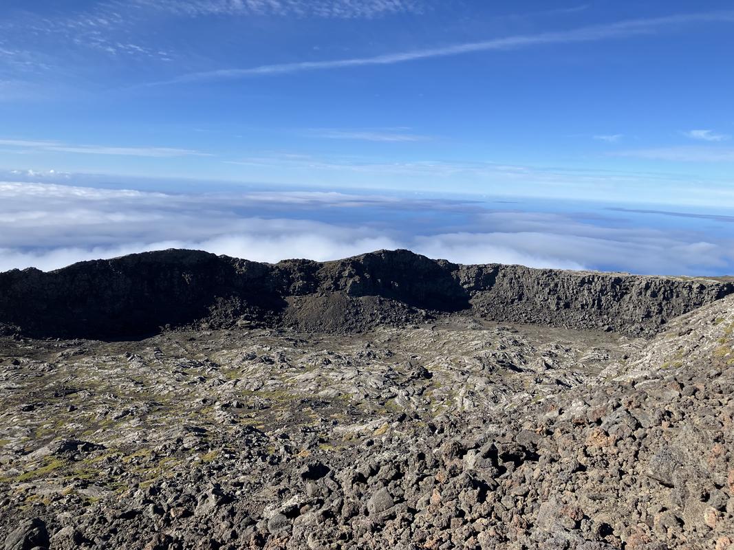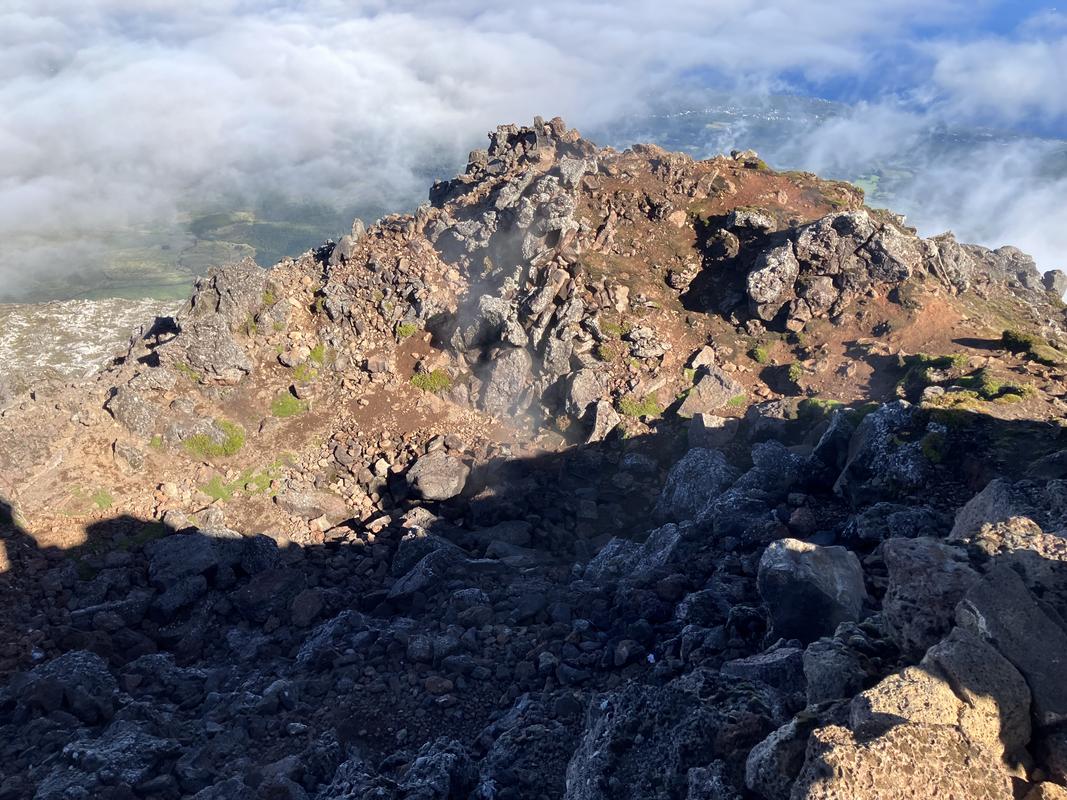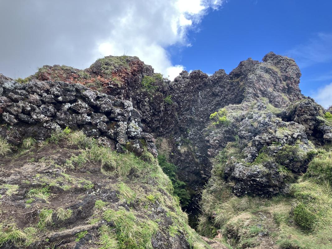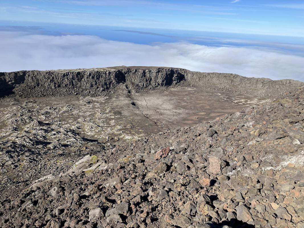 Vrchol už je na dosah. Nejprve ale musíme sestoupit do sopečného kráteru. Vyfotil jsem v něm lávovou jeskyňku i zajímavé pukliny.