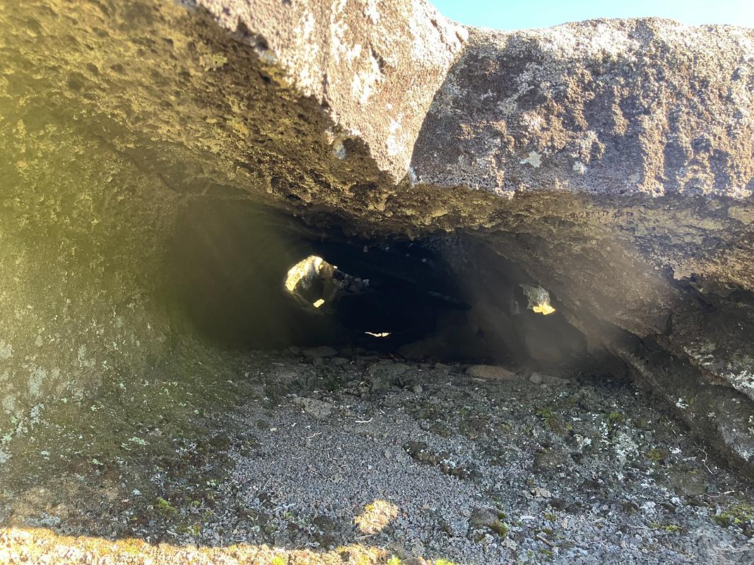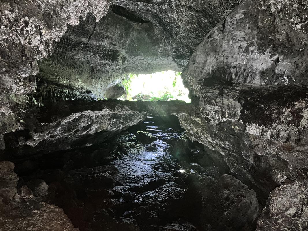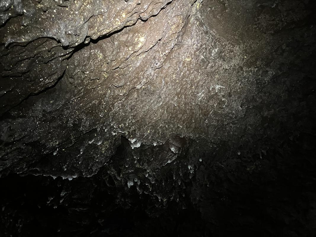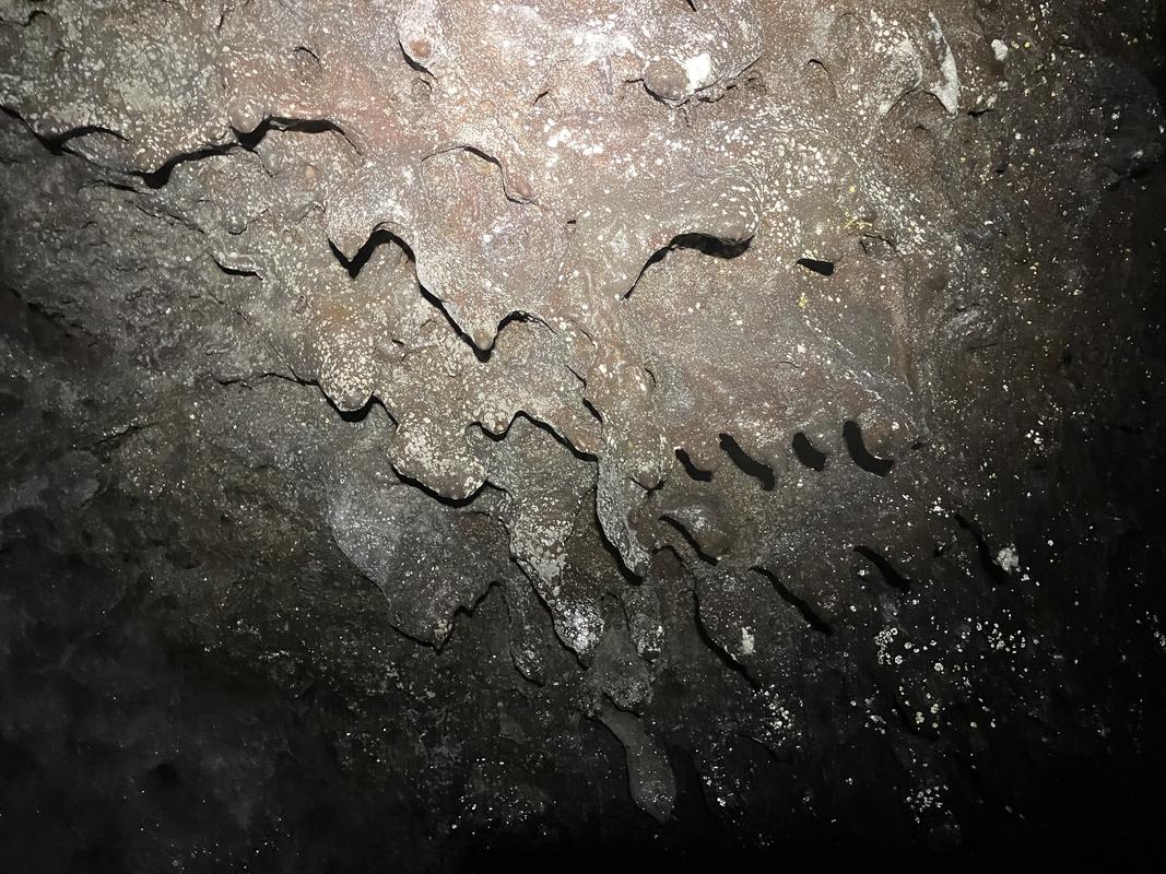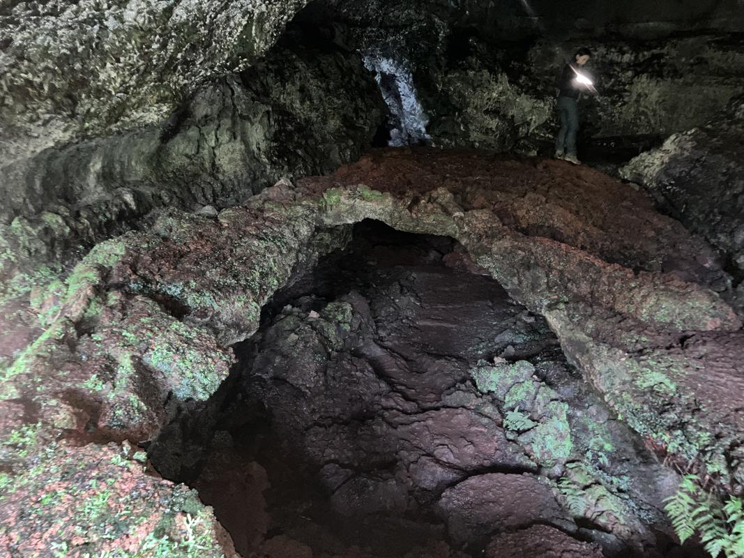 Jedná se o systém několika lávových tunelů s celkovou zatím známou délkou cca 920 metrů. Konečně jsme využili naše čelovky a pronikli do nitra země skrz vchod hustě porostlý mechem. Nejrozsáhlejší, cca 600 m dlouhý tunel má minimálně jedno patro nad i pod námi. Nacházíme v něm krápníky i suť z popadaných stropů. Je slepý, narozdíl od vedlejší kratší jeskyně, která má dva vchody (a také minimálně dvě patra).