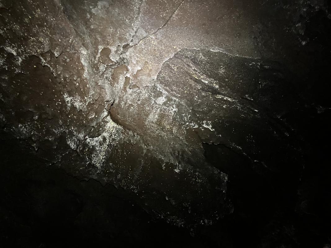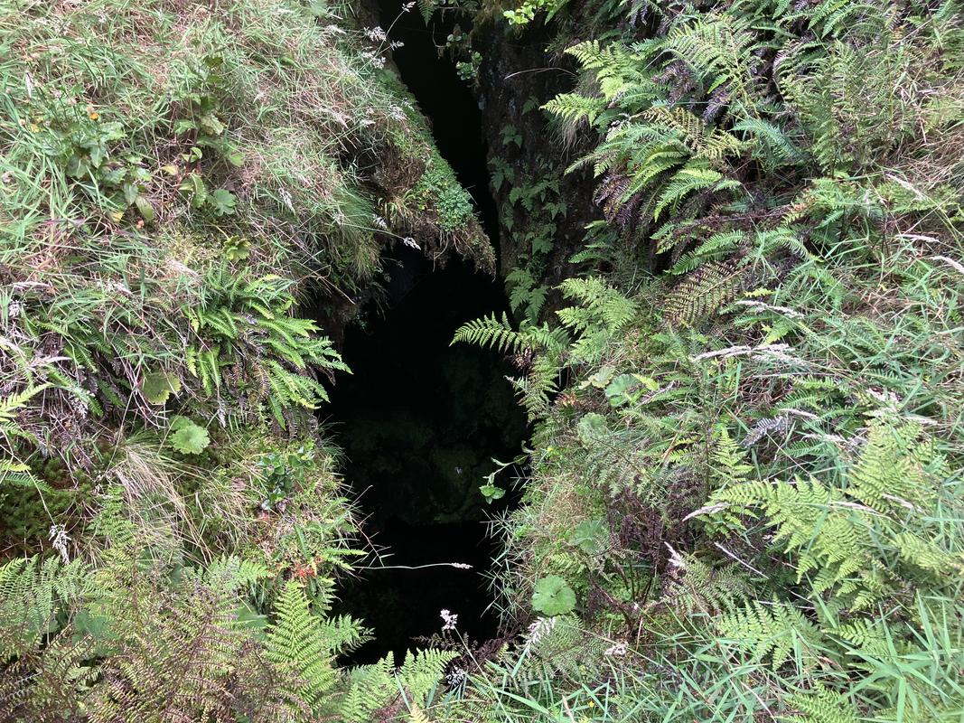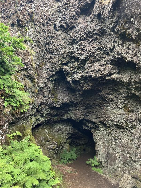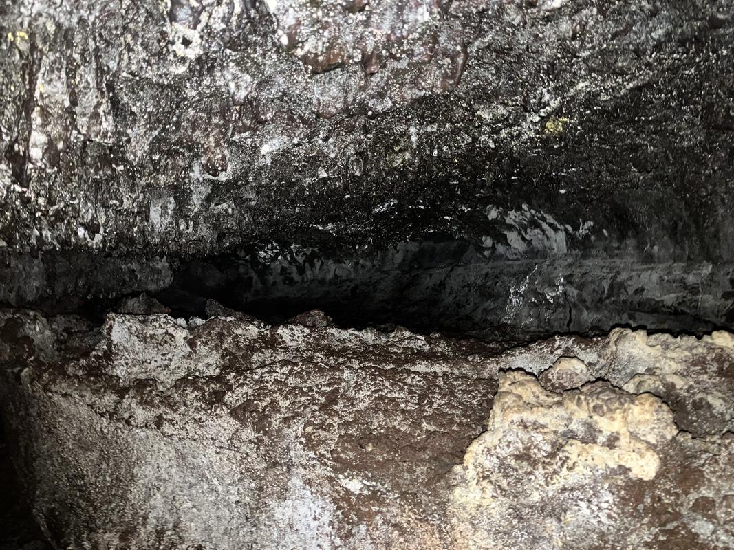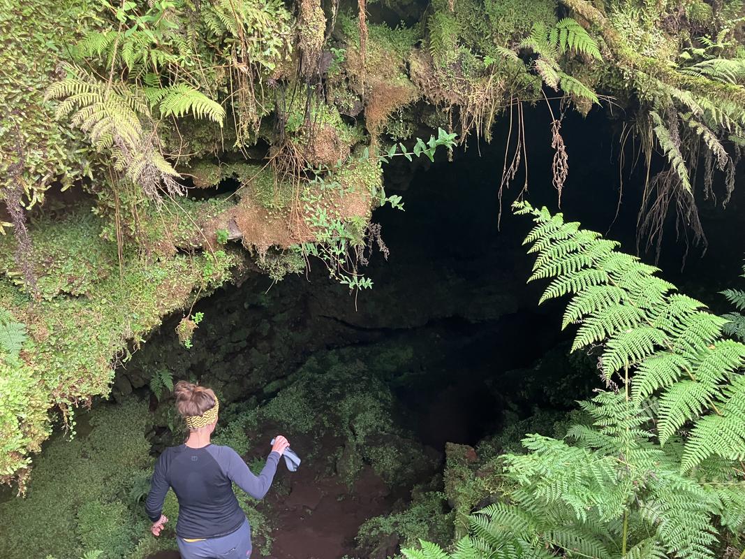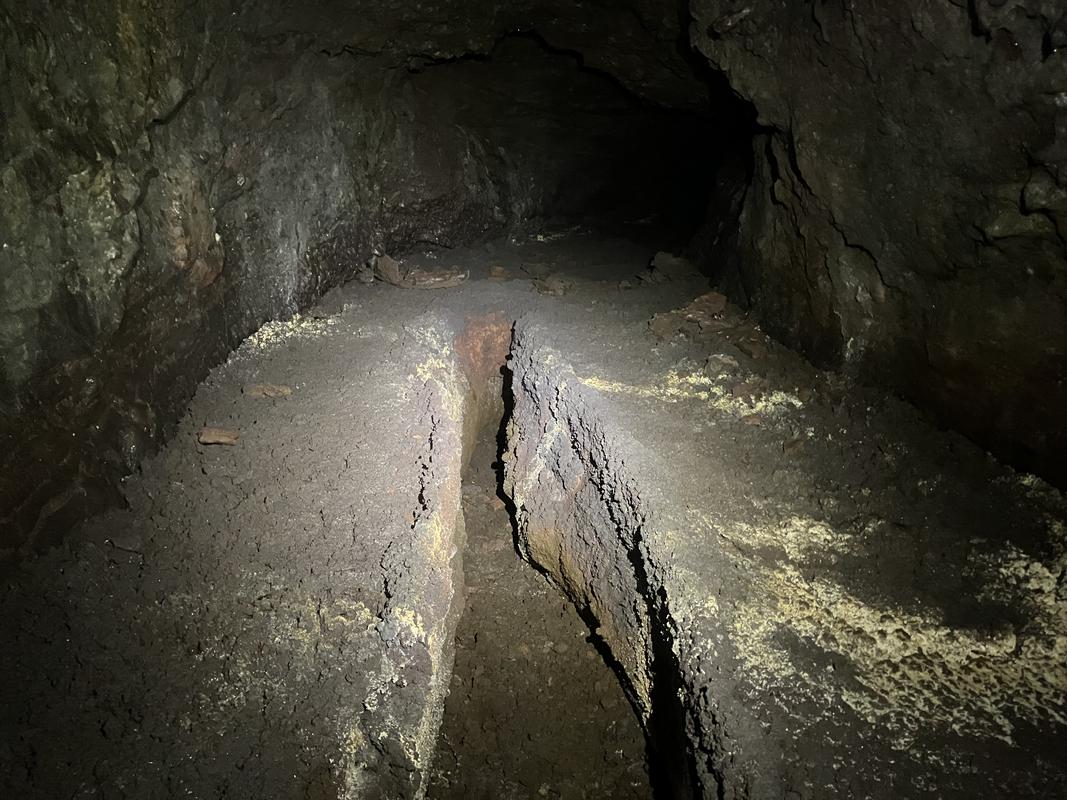 Jedná se o systém několika lávových tunelů s celkovou zatím známou délkou cca 920 metrů. Konečně jsme využili naše čelovky a pronikli do nitra země skrz vchod hustě porostlý mechem. Nejrozsáhlejší, cca 600 m dlouhý tunel má minimálně jedno patro nad i pod námi. Nacházíme v něm krápníky i suť z popadaných stropů. Je slepý, narozdíl od vedlejší kratší jeskyně, která má dva vchody (a také minimálně dvě patra).
