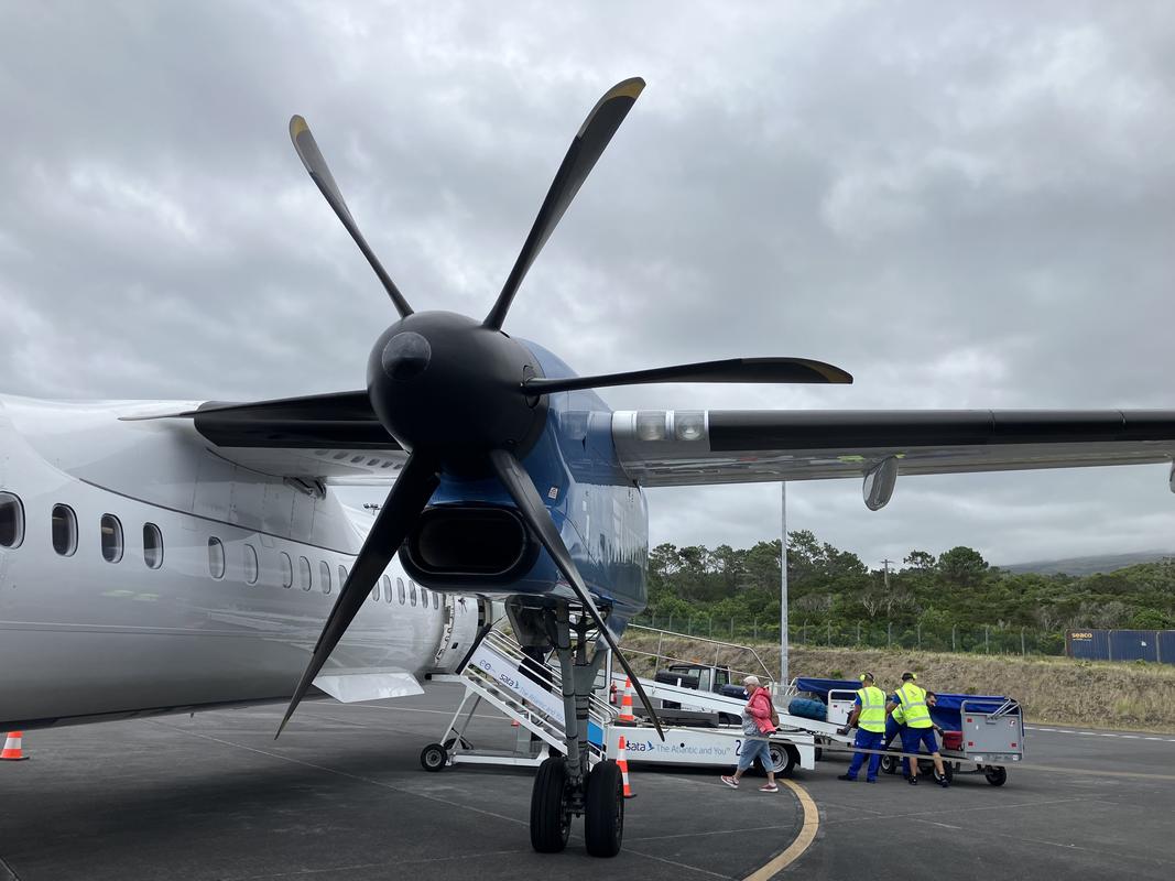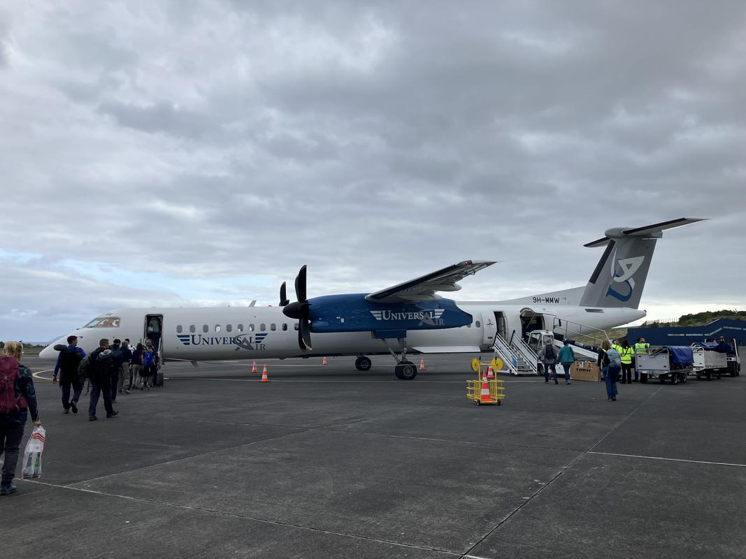 Po odbavení zavazadel jsme čekali, až nás pustí do letadla. Nastoupili jsme opět do vrtulového Bombardieru DHC-8-400 společnosti Universal Air, a stejně jako minule trasu našeho letu ignoroval Flightaware. V Ponta Delgada jsme přistáli po cca 33 minutách letu.