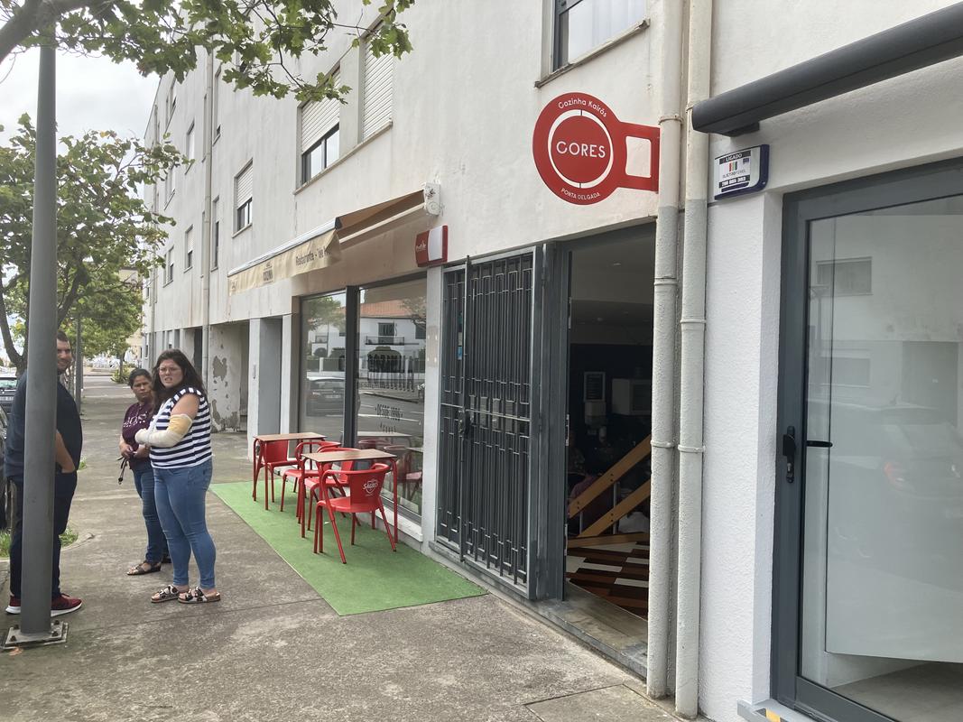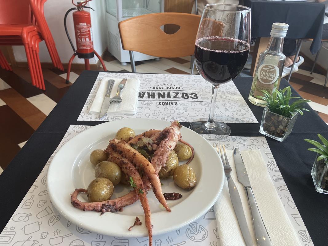 Já si vyfotil zajímavé apartmánové sídliště, v jehož těsném sousedství se pásly krávy, a pak jsem urval stůl v docela zaplněné lidové jídelně Cozinha Kairós. Místní sem evidentně chodí na oběd, mají zde několik polévek a výběr masných i vege jídel. Já si dopřál chutnou chobotnici, ke které mi vrchní doporučil „vinho de casa“. Sklenička jakéhosi červeného mému zobáku moc nechutnala.