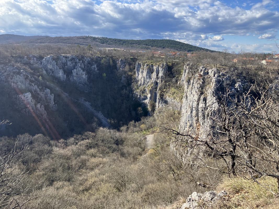 Pohodlná lesní cesta nás dovedla k vyhlídce Belveder, odkud je nádherně vidět propast Velika dolina. Dáše si pohledy do hluboké a příkré propasti moc neužívá, fotí téměř naslepo. Zbývalo už jen pár metrů do infocentra Škocjanských jeskyní.