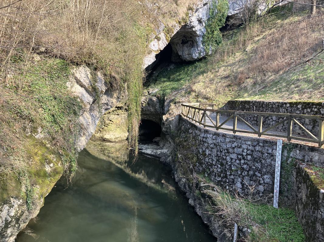 Máme dost času, zdejší personál teprve nastupuje a většina obchůdků i občerstvení ještě neotevřela. Obkroužili jsme malé kolečko okolo infocentra, restaurace Jamski dvorec a řeky Pivky, která zdejší jeskynní systém již několik milionů let pilně buduje.