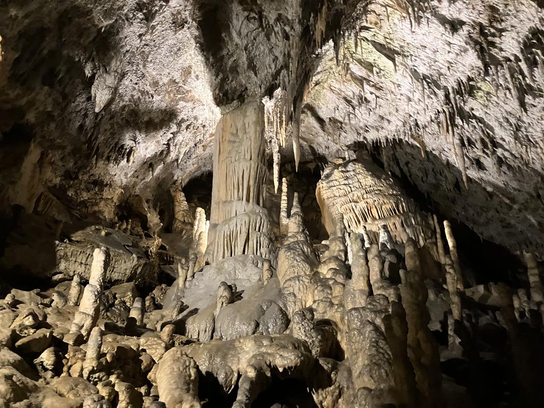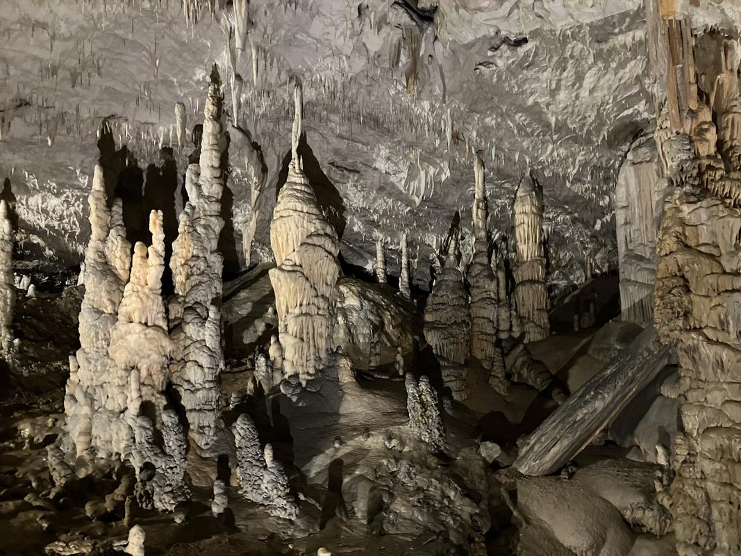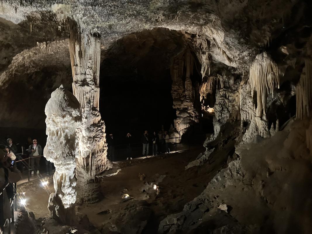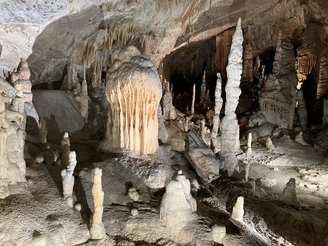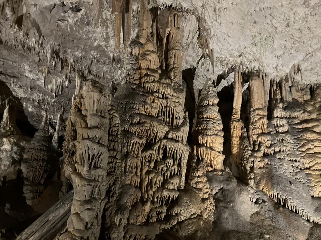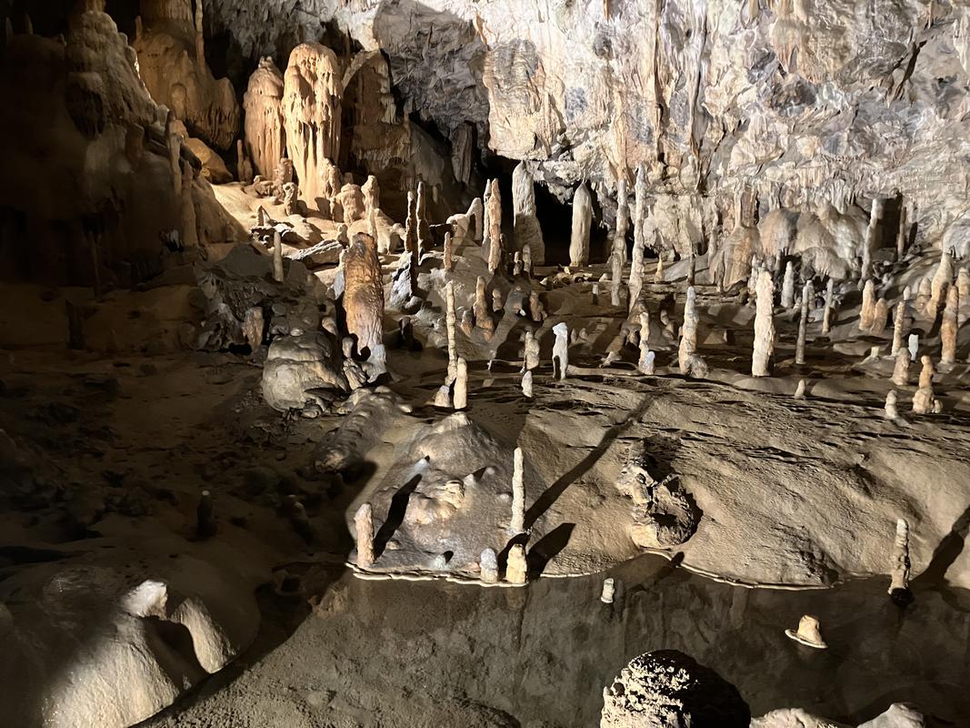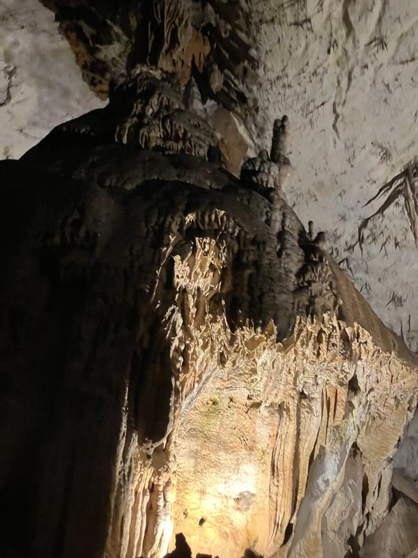 Už cesta vláčkem byla zajímavá. Trasa vedla nádherně vyzdobenými chodbami s nasvícenými krápníky, jenomže vlak jel tak rychle, že rozumně vyfotit se skoro nic nedalo. Během jízdy jsem se párkrát leknul, že křísnu hlavou o skálu, ale ani mně, popř. někomu mnohem vyššímu se nic nestalo. Trasu vlaku, stejně jako prohlídky jeskyně, jsem si naklikal na mapy.com, takže vím, že jsme ujeli cca 1.6 km.
