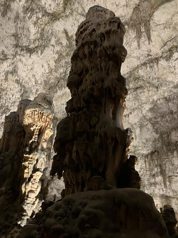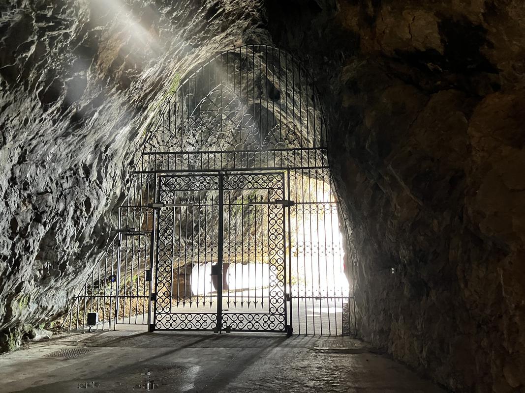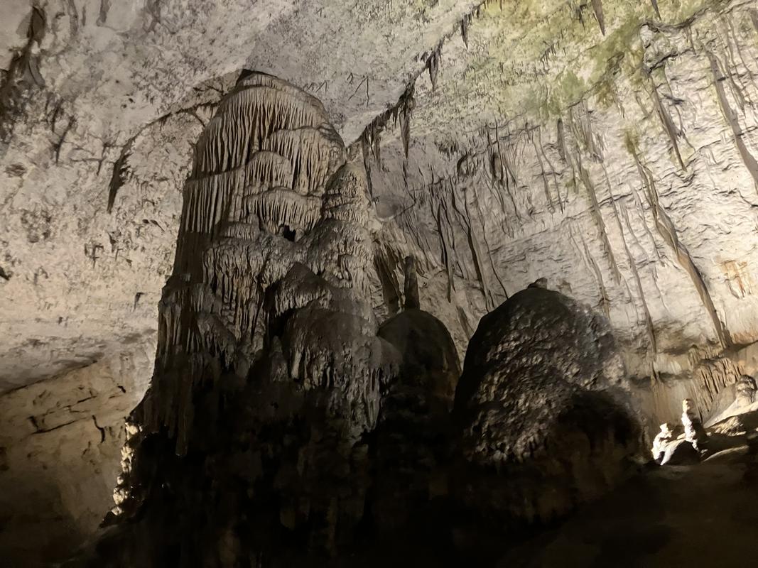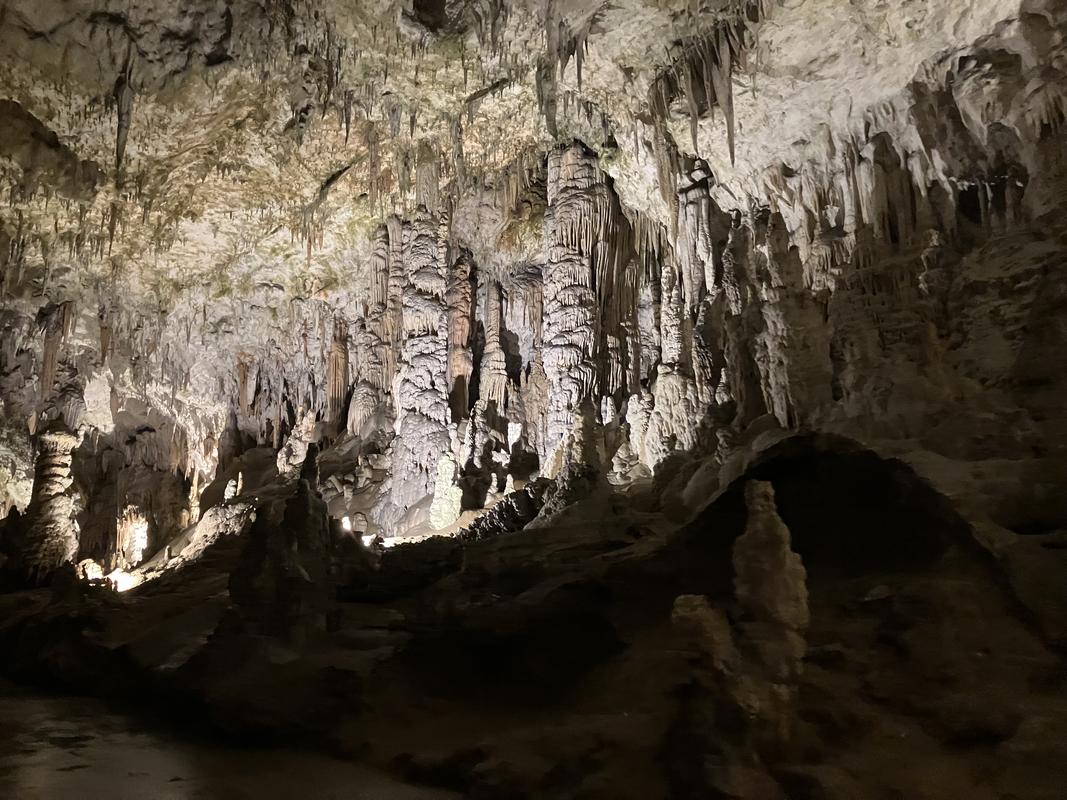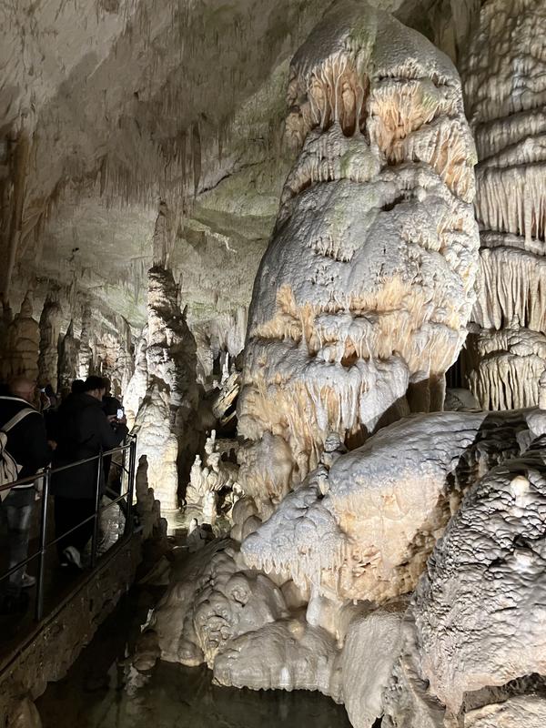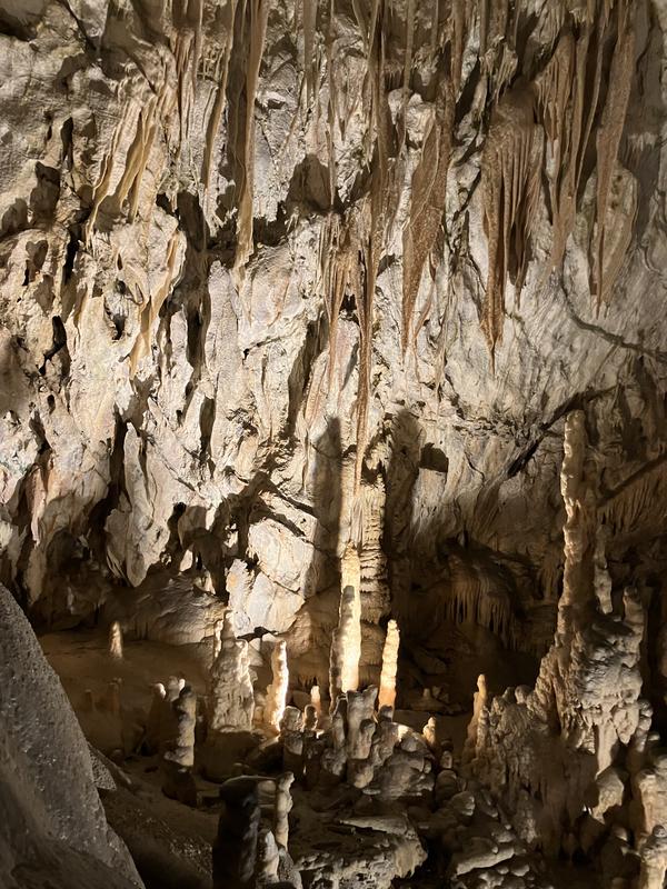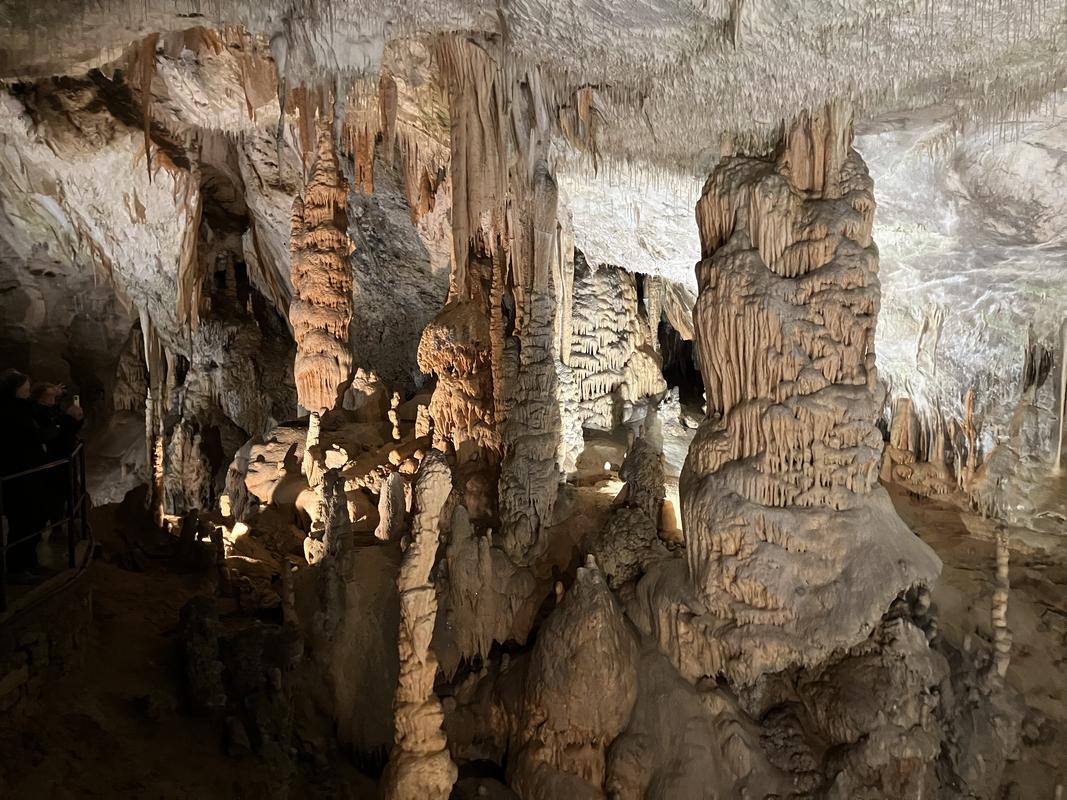 Už cesta vláčkem byla zajímavá. Trasa vedla nádherně vyzdobenými chodbami s nasvícenými krápníky, jenomže vlak jel tak rychle, že rozumně vyfotit se skoro nic nedalo. Během jízdy jsem se párkrát leknul, že křísnu hlavou o skálu, ale ani mně, popř. někomu mnohem vyššímu se nic nestalo. Trasu vlaku, stejně jako prohlídky jeskyně, jsem si naklikal na mapy.com, takže vím, že jsme ujeli cca 1.6 km.