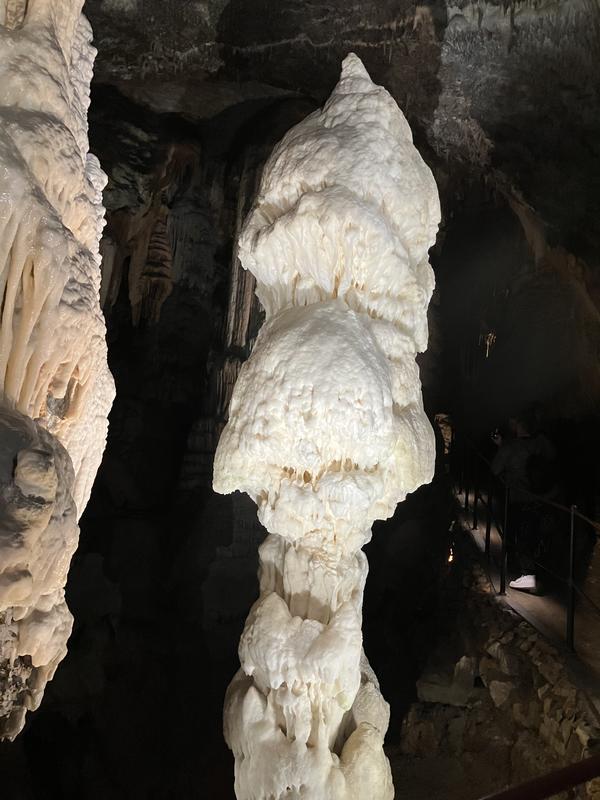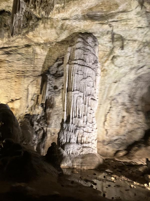 O chvíli později klesáme do nejnižšího bodu trasy a následně pod stejným mostem procházíme a směřujeme k sálu s největší chloubou a symbolem zdejšího areálu, bílým stalagmitem zvaným Briliant.
