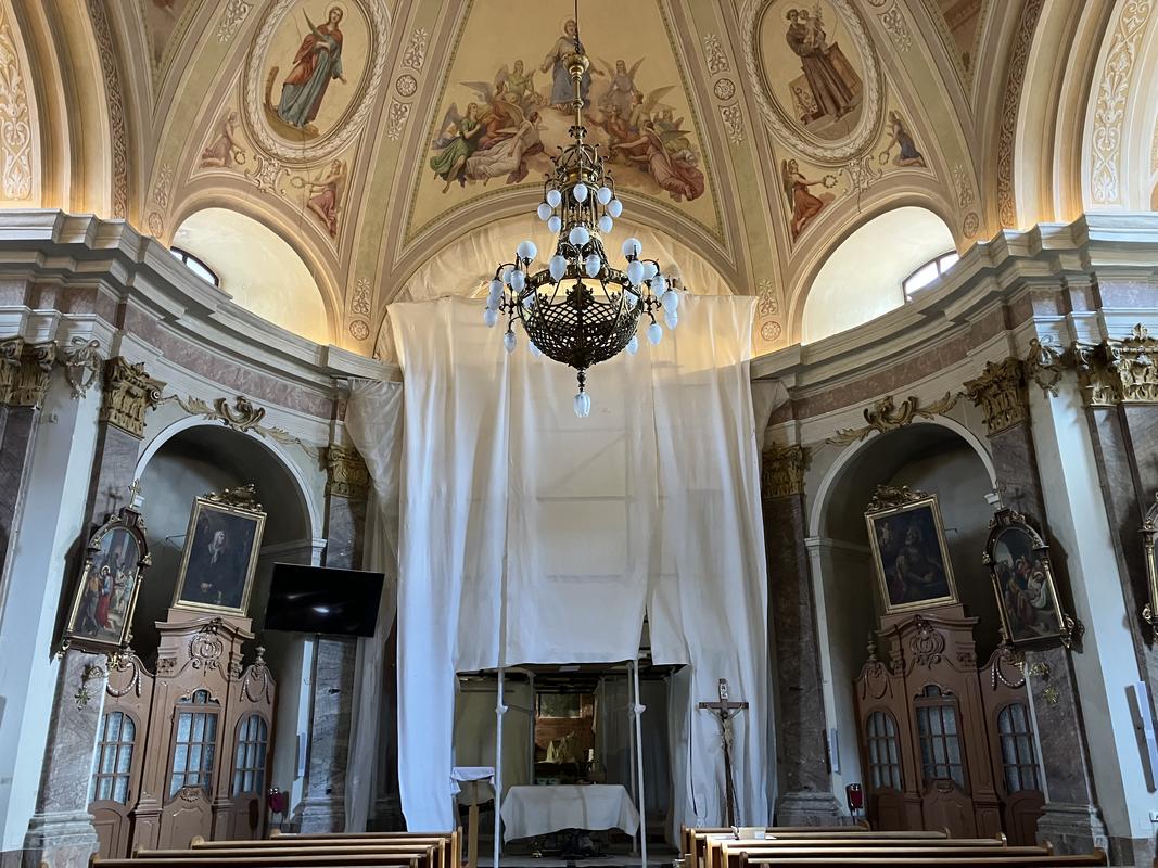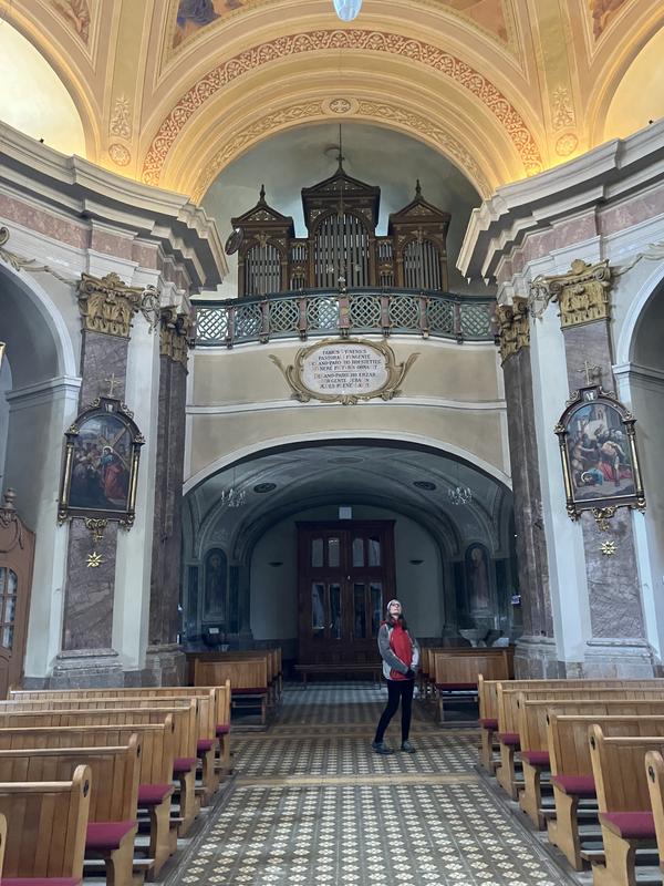 Zrovna byl čas oběda, tak jsme navštívili samoobslužnou restauraci Briliant. Žádné místní speciality tu nenabízí, musel jsem se spokojit s porcí kuřecích paliček s hranolkama, která byla tradičně “po slovinsku” vydatná. S plným břichem jsme ještě nakoukli do kostela sv. Štefana. Je sice kvůli rekonstrukci zavřený, my ale měli štěstí na otevřené dveře. Nikdo nás nevyhnal.