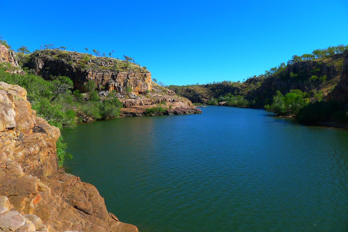 Pokračovali jsme údolím dolů ke břehu řeky (GPS souřadnice: S14.31242° E132.44469°). Ani tady jsme se nevykoupali. Občas sem během záplav zabloudí mladí samci mořských krokodýlů, kteří si hledají svoje teritorium (od moře musí urazit skoro 400 km). Pravděpodobnost jejich výskytu je minimální, v Katherine River nemají vhodné podmínky pro život, ale do vody se smí vstupovat až nad druhou soutěskou, což bylo ještě pár kilometrů proti proudu.
