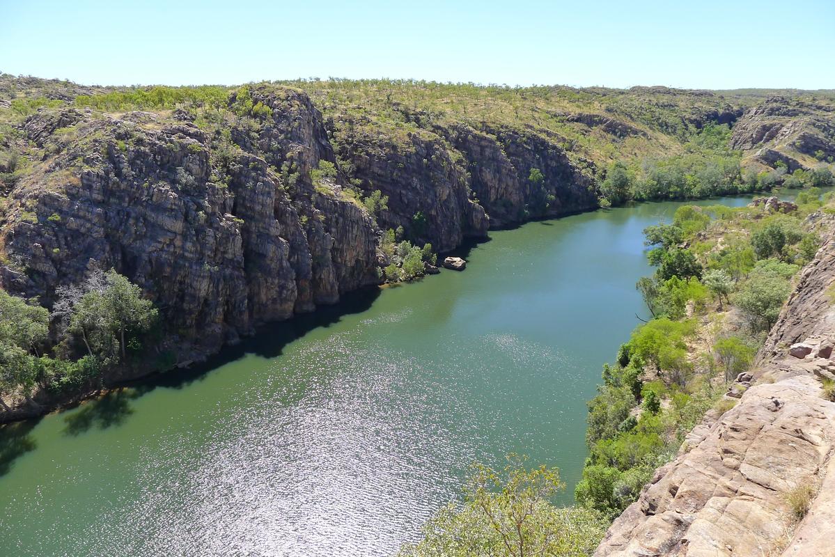 Zpátky jsme museli stejnou cestou údolím a po schodech. Zaskočili jsme si na Pat’s Lookout (GPS souřadnice: S13.09860° E130.78382°) s krásnými výhledy na řeku.