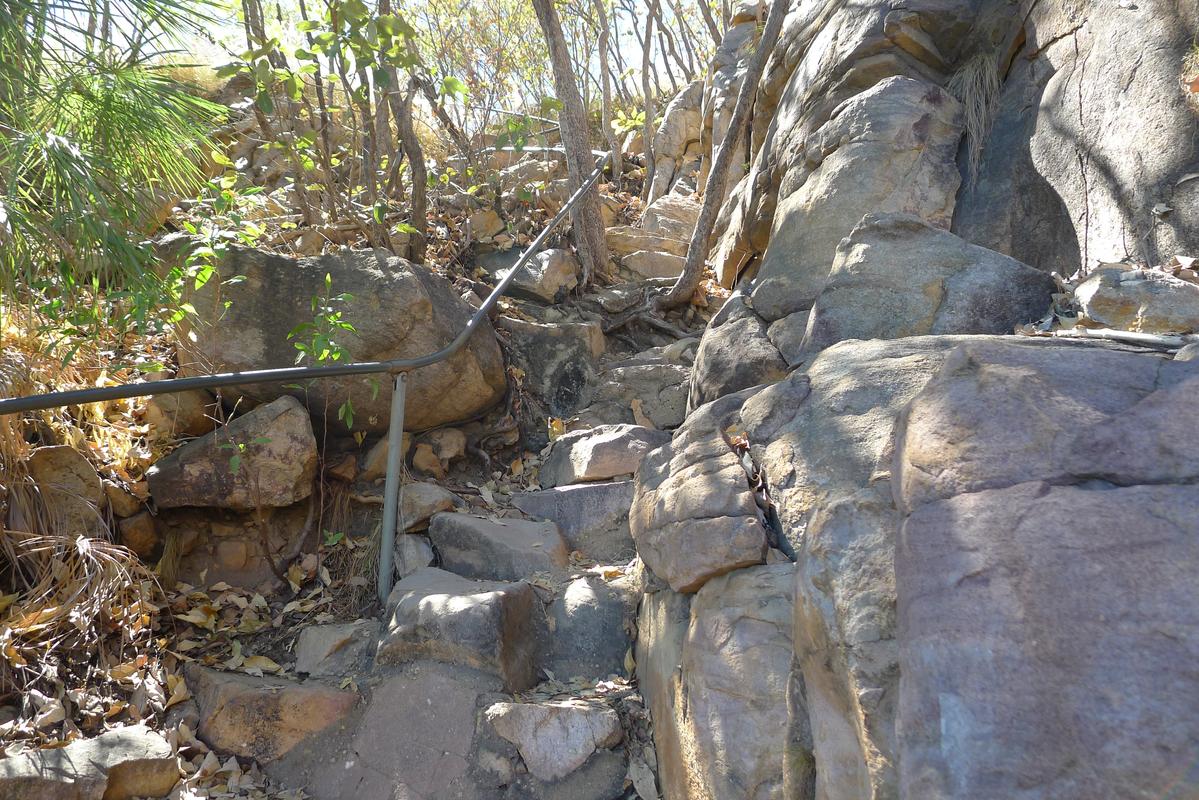 Na křižovatce s Windolf Walk (GPS souřadnice: S14.32219° E132.43251°) jsem se občerstvil z vodního tanku, příjemné osvěžení na rozpálených pláních. Společně jsme prošli vysychající plání plnou skalek a skalních ploten, a v závěru klesli po schodech do údolí se Southern Rockhole (GPS souřadnice: S14.31319° E132.44376°). Vodopád už bohužel téměř vyschl, zbyla tu po něm jen malinko zakalená tůňka, do které se mi lézt nechtělo.