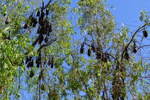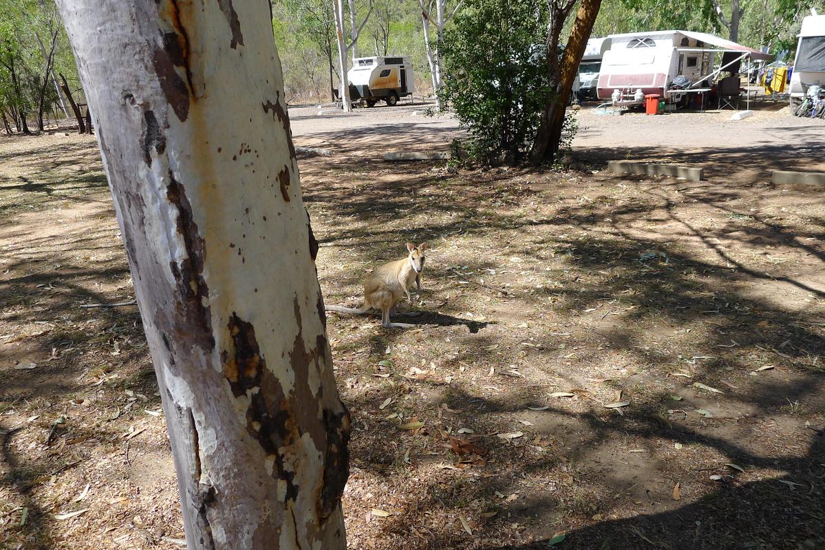Před kempem jsme narazili na stromy obsypané Flying Foxes (druh velkých netopýrů), a přímo k našemu autu nás přišel navštívit walabi. Pokusil jsem se k němu přiblížit co nejvíc, měl jsem štěstí, že mezi námi byl mohutný blahovičník, za který jsem se mohl schovat. Dokázal jsem se dostat na 5 metrů od něho.