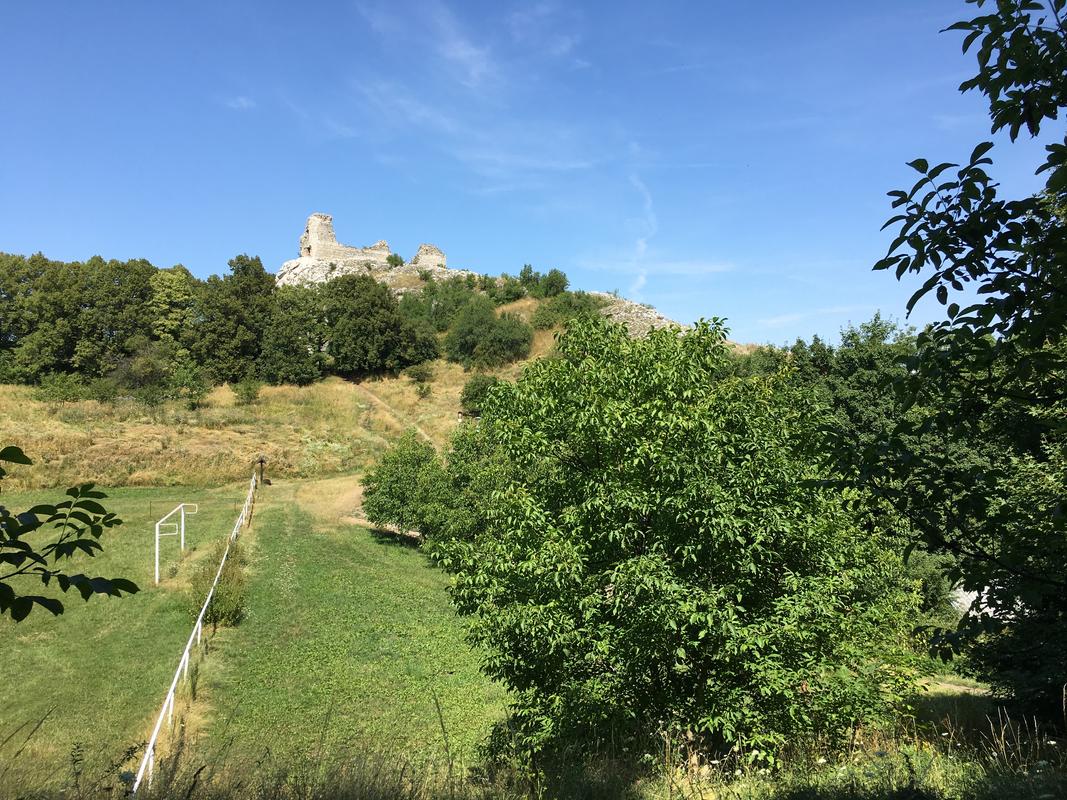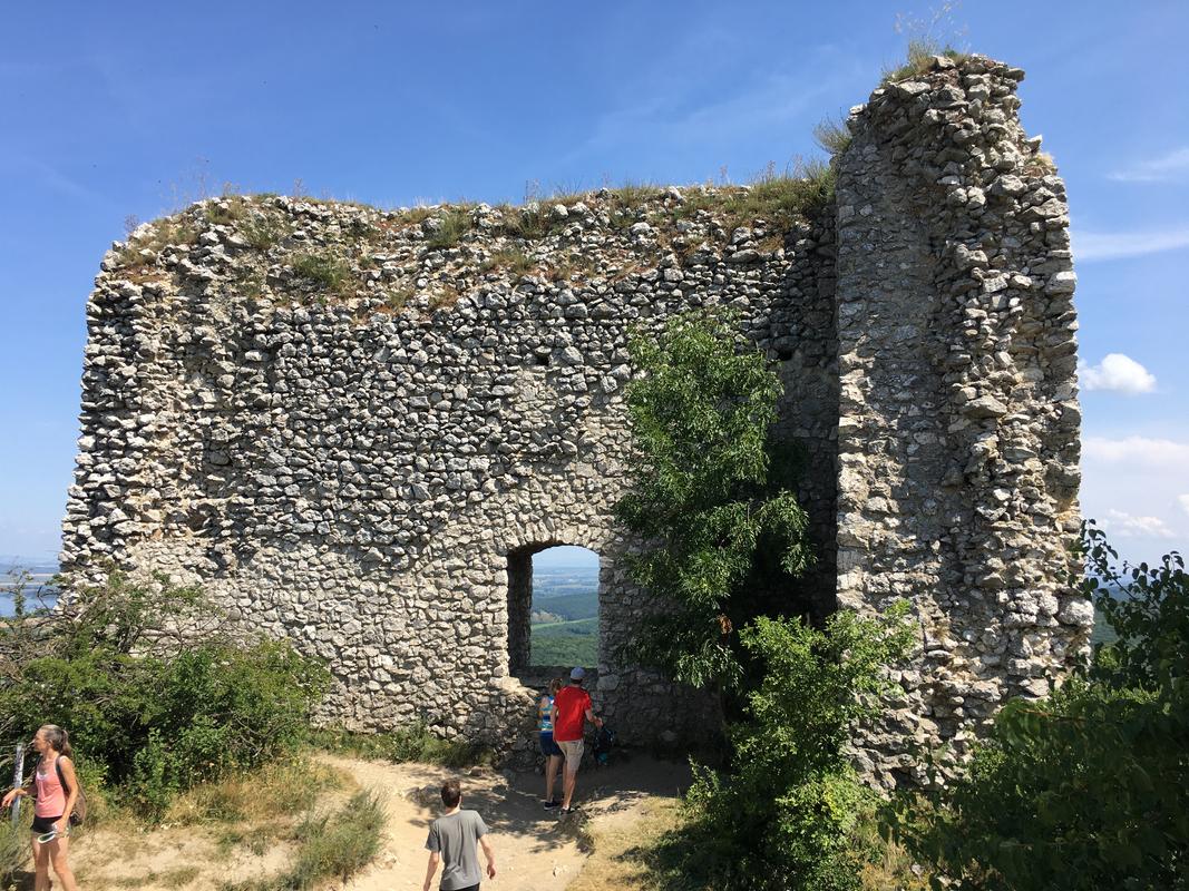 Stoupáme dál, nejdříve mezi vinicemi, později ve stínu lesa. Na hradě probíhá rekonstrukce, naštěstí za normálního turistického provozu. Vstupné činilo 50 Kč. Kocháme se výhledy do kraje a opatrně obcházíme zakleté okno :-).