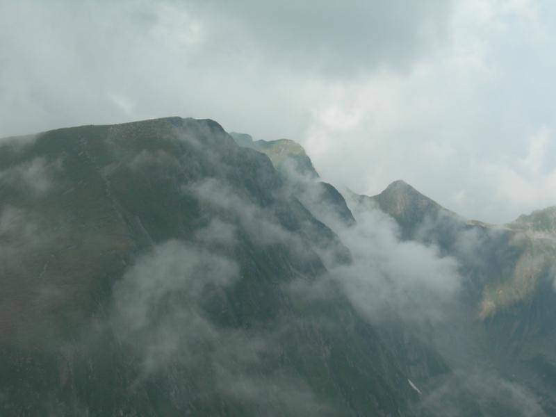 blízký vrcholek. Hřeben je v mlze, funguje jako přehrada na mraky. Nějaký čas je zadržuje, pak se přes něj převalí a tak pořád dokola.