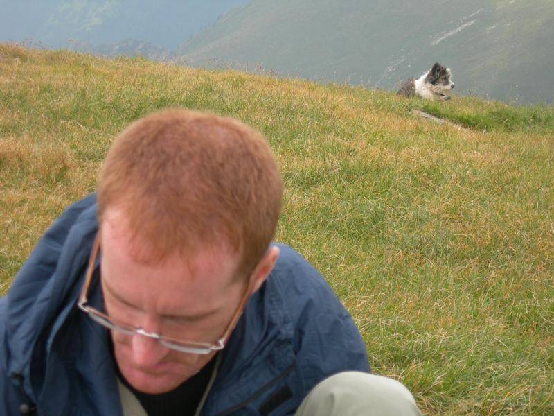 Projdeme sedly Fereastra Mare (další odbočka do údolí Simbetei) a Fereastra Mic. Občerstvujeme se pod Vf. Galasescu Mic. (2433 m.), dohlíží na nás ovčácký pes. Já si před obědem omrknu