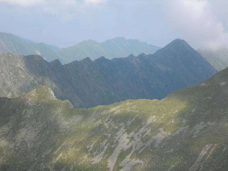 Rozeklané hřebeny Fagaraše teď výjimečně nemusí zachytávat mračna, tak zadržují alespoň skalničky. Sestupujeme do sedla Portita Vistei, kde je refugiu (jsme tam po 50 minutách chůze). Za ním se tyčí hora Moldoveanu, před ním hora odpadků.