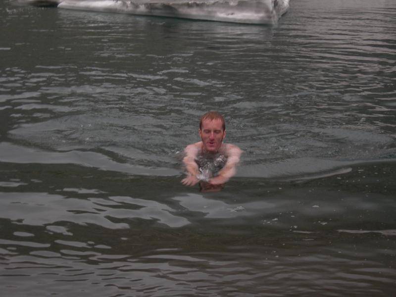 A rum v žilách ponouká k nepředloženostem. Polovina výpravy se jde vykoupat k ledovému jezírku, na kterém dosud plují kry. Čecháčkovi předávám foťák, aby zdokumentoval případné infarty a utonutí. První