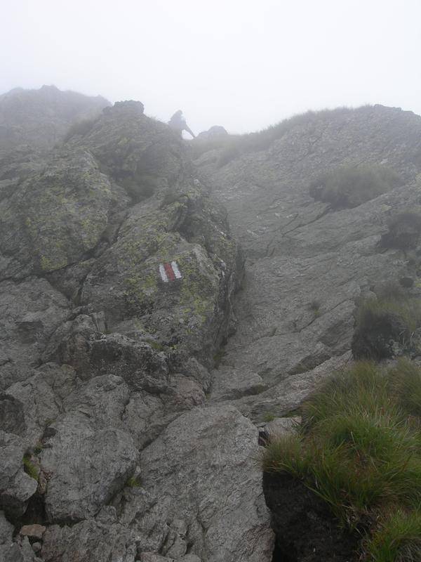 se spoustou stupů a chytů. Těch pár převisů se dá zdolat i s batohem, popř. s pomocí všudypřítomných řetězů. Za necelou půlhodinu jsme nahoře v sedle, odkud máme vrchol Negoiu na dosah. Fotím hřebínek táhnoucí se