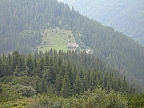 Po odpočinku stoupáme po červeném kolečku k hranici kleče (25 min.), pak pokračujeme pod Vf. Mosuleatana (začíná trošku pršet), dále po modrém trojúhelníku do sedla (saua) Calului. Tam potkáváme první stádo ovcí