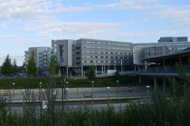 V Oslu na letišti většina z nás povečeřela z vlastních zásob, já si je ovšem šetřil na Špicberky. Letištní bufet mne nejprve zklamal nic moc těstovinami (cena 41.04 NOK ~ 139.43 Kč), vzápětí to ale napravil chutným párkem v rohlíku (cena 42 NOK ~ 142.59 Kč). Vybral jsem si v bankomatu 4000 NOK v hotovosti, KB mi za to strhla z účtu 13 474.28 Kč + poplatek 134.74 Kč. Do odletu návazného spoje do Tromsø zbývalo moře času, nebe nad námi se po prudší přeháňce vyjasnilo, takže noc před ranním výletem do Osla jsme se rozhodli přečkat pod širákem jen pár set metrů od východu z letiště. Nachází se tam malý parčík s výhledem na železnici a hotel Radisson Blu, ve kterém přespávají posádky letadel. Žádná neodbytná letuška se mi do spacáku nedobývala, ani nikdo další si nás nevšímal, vyspali jsme se do růžova.